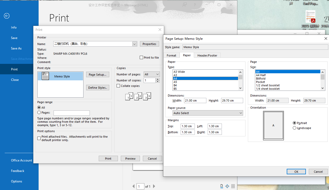 在Outook上打印邮件,选择打印机后,在Properties选项中选择切换为A4纸张,程序提示下图。