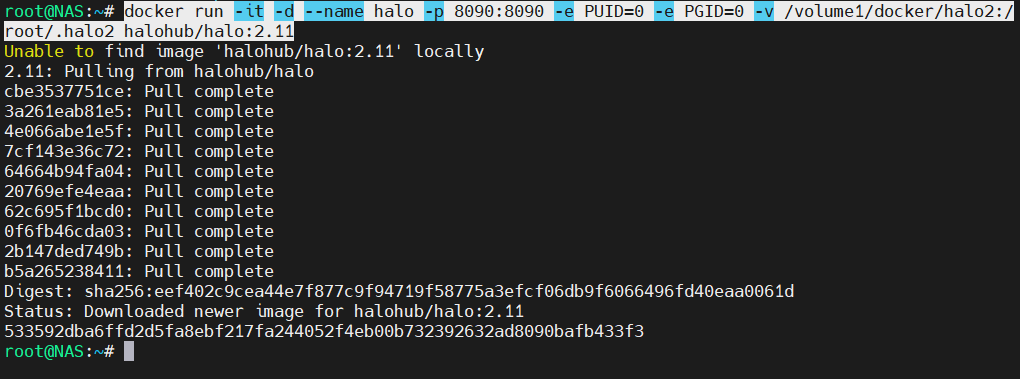 -v:工作目录映射。形式为:-v 宿主机路径:/root/.halo2,后者不能修改。docker run -it -d --name halo -p 8090:8090 -e PUID=0 -e PGID=0 -v /volume1/docker/halo2:/root/.halo2 halohub/halo:2.11