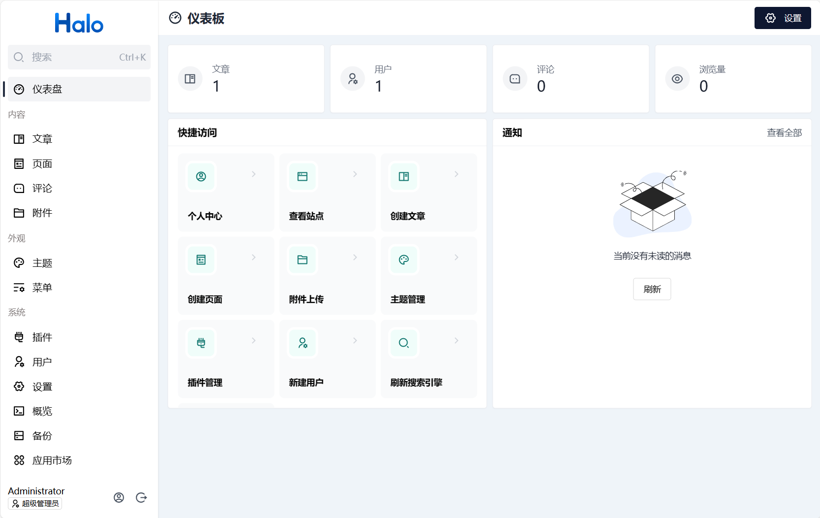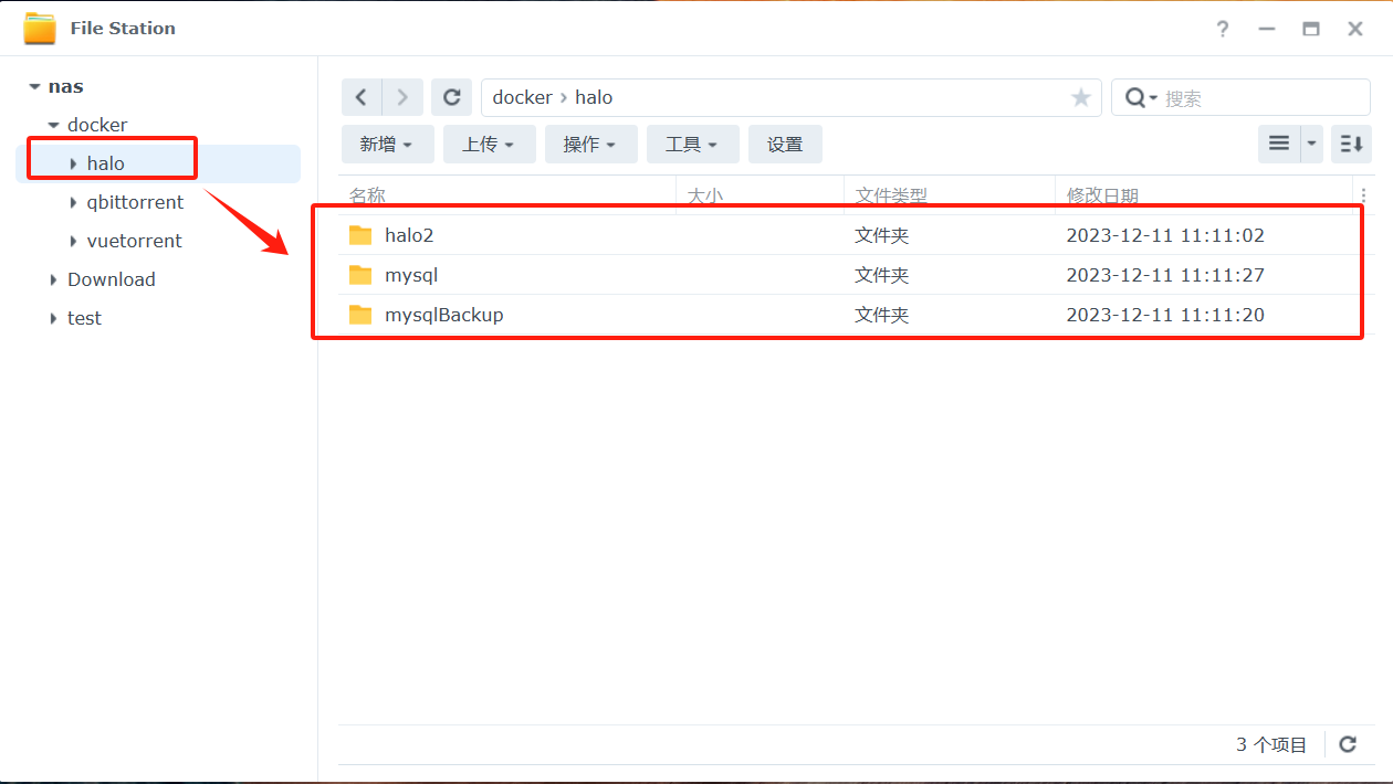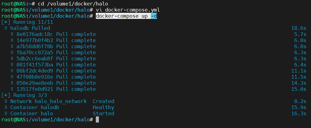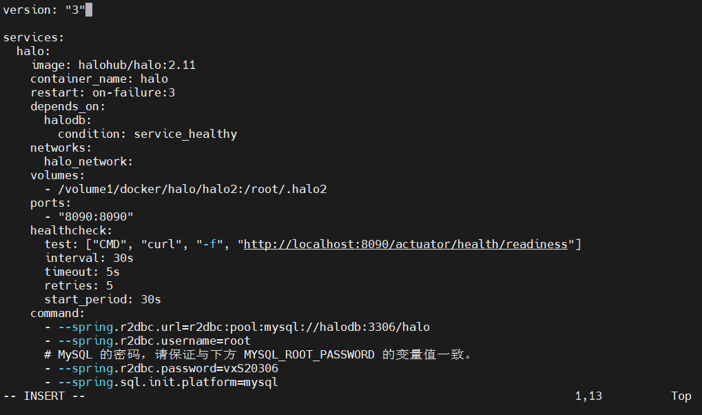 (记得修改自己的必要信息)version: "3" services: halo: image: halohub/halo:2.11 container_name: halo restart: on-failure:3 depends_on: halodb: condition: service_healthy networks: halo_network: volumes: - /volume1/docker/halo/halo2:/root/.halo2 #修改为你自己的文件夹路径 ports: - "8090:8090" #前面的是设置外部访问端口为8090 healthcheck: test: ["CMD", "curl", "-f", "http://localhost:8090/actuator/health/readiness"] interval: 30s timeout: 5s retries: 5 start_period: 30s command: - --spring.r2dbc.url=r2dbc:pool:mysql://halodb:3306/halo - --spring.r2dbc.username=root # MySQL 的密码,请保证与下方 MYSQL_ROOT_PASSWORD 的变量值一致。 - --spring.r2dbc.password=vxS20306 #数据库密码,要和下面的数据库容器密码一致。 - --spring.sql.init.platform=mysql # 外部访问地址,请根据实际需要修改 - --halo.external-url=http://localhost:8090/ halodb: image: mysql:8.1.0 container_name: halodb restart: on-failure:3 networks: halo_network: command: - --default-authentication-plugin=caching_sha2_password - --character-set-server=utf8mb4 - --collation-server=utf8mb4_general_ci - --explicit_defaults_for_timestamp=true volumes: - /volume1/docker/halo/mysql:/var/lib/mysql #修改为你自己的文件夹路径 - /volume1/docker/halo/mysqlBackup:/data/mysqlBackup #修改为你自己的文件夹路径 ports: - "3306:3306" healthcheck: test: ["CMD", "mysqladmin", "ping", "-h", "127.0.0.1", "--silent"] interval: 3s retries: 5 start_period: 30s environment: # 请修改此密码,并对应修改上方 Halo 服务的 SPRING_R2DBC_PASSWORD 变量值 - MYSQL_ROOT_PASSWORD=vxS20306 #数据库密码 - MYSQL_DATABASE=halo networks: halo_network: