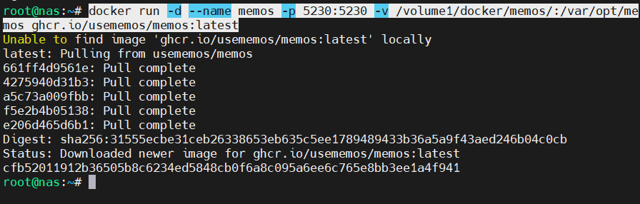 docker run -d --name memos -p 5230:5230 -v /volume1/docker/memos/:/var/opt/memos ghcr.io/usememos/memos:latest