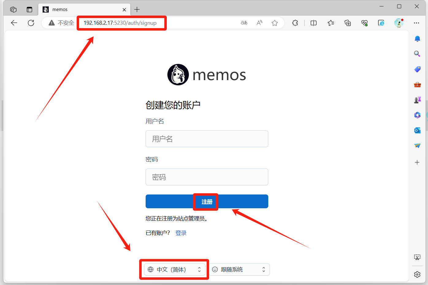 打开浏览器,以群号的IP+设置的端口号进行访问,选择中文语言并注册登录。