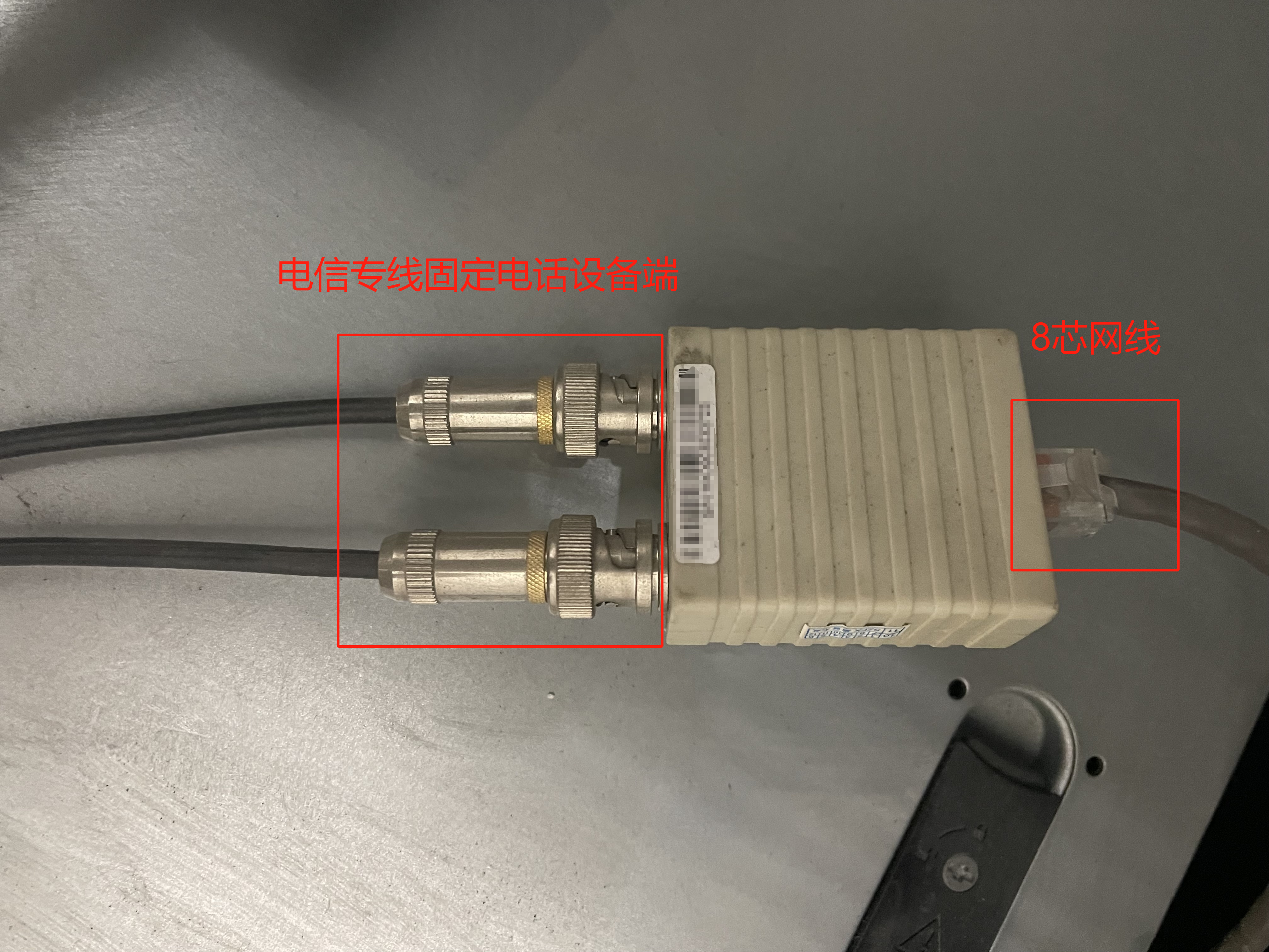 将电信专线固定电话设备的黑色线缆连接到转接器