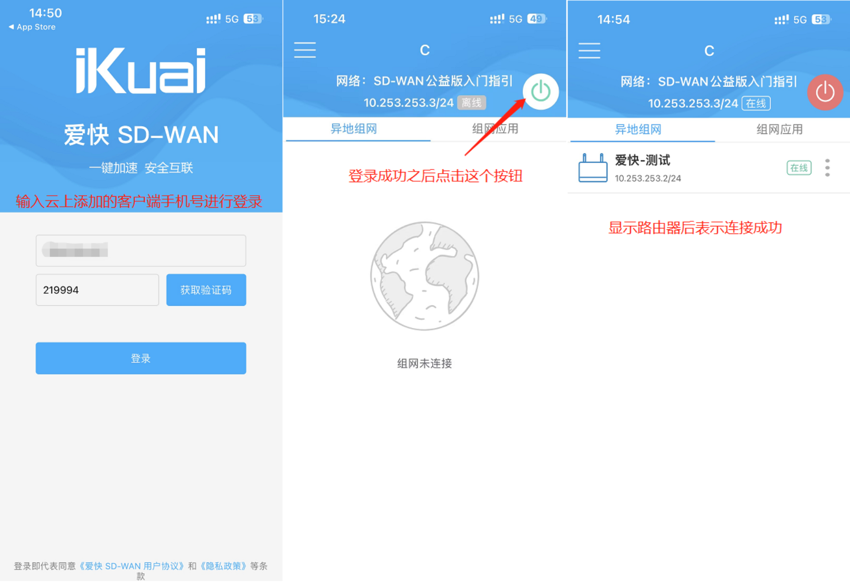 手机/电脑上安装iKuai SD-WAN客户端,使用前面组网添加的手机号进行登录,点击连接即可。