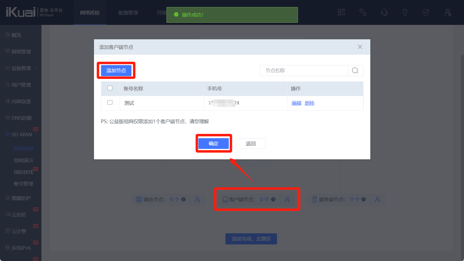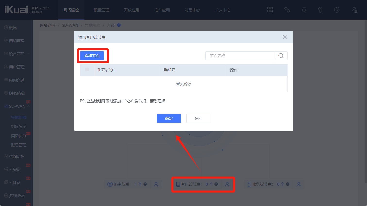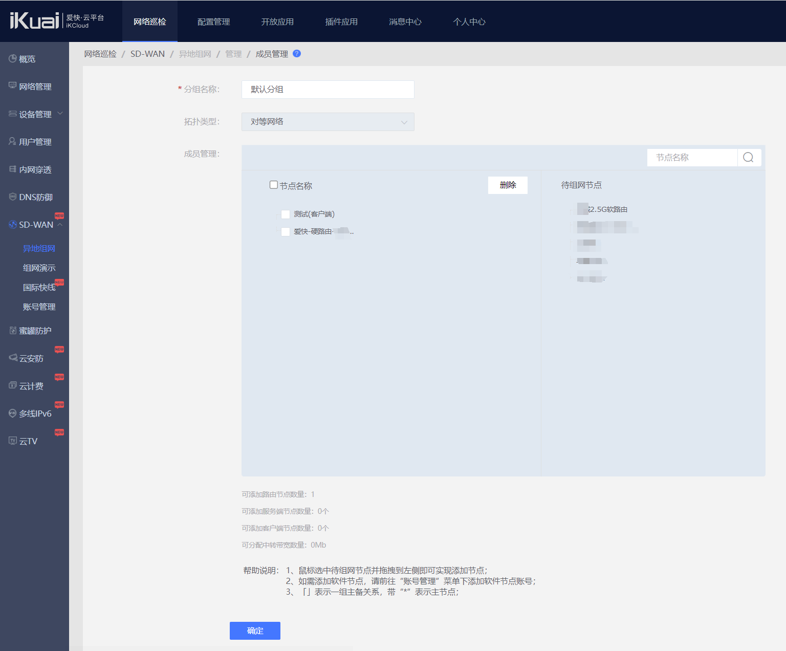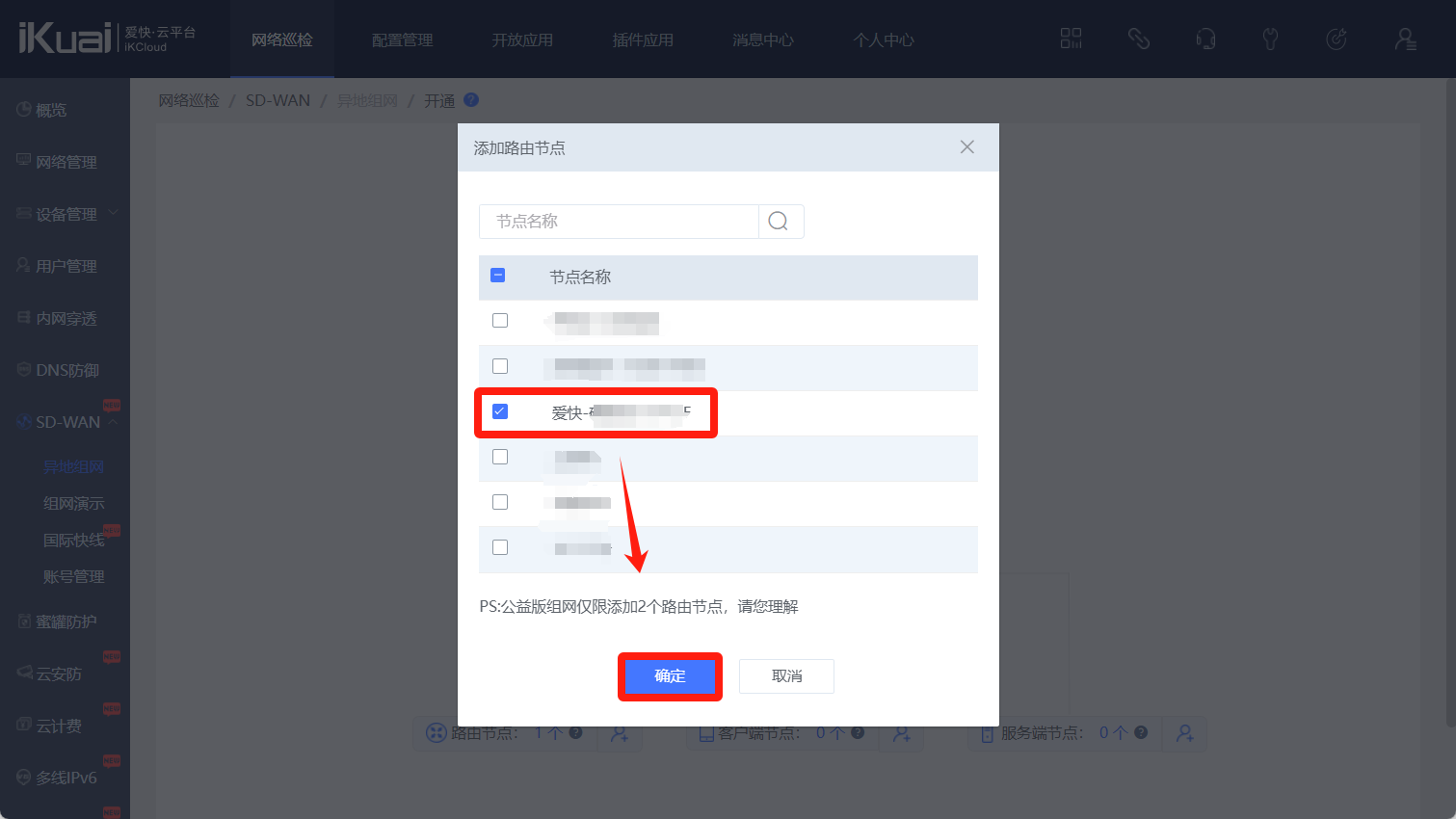 点击添加路由节点,选择你需要组网的路由器(已绑定爱快云的),点击确定。