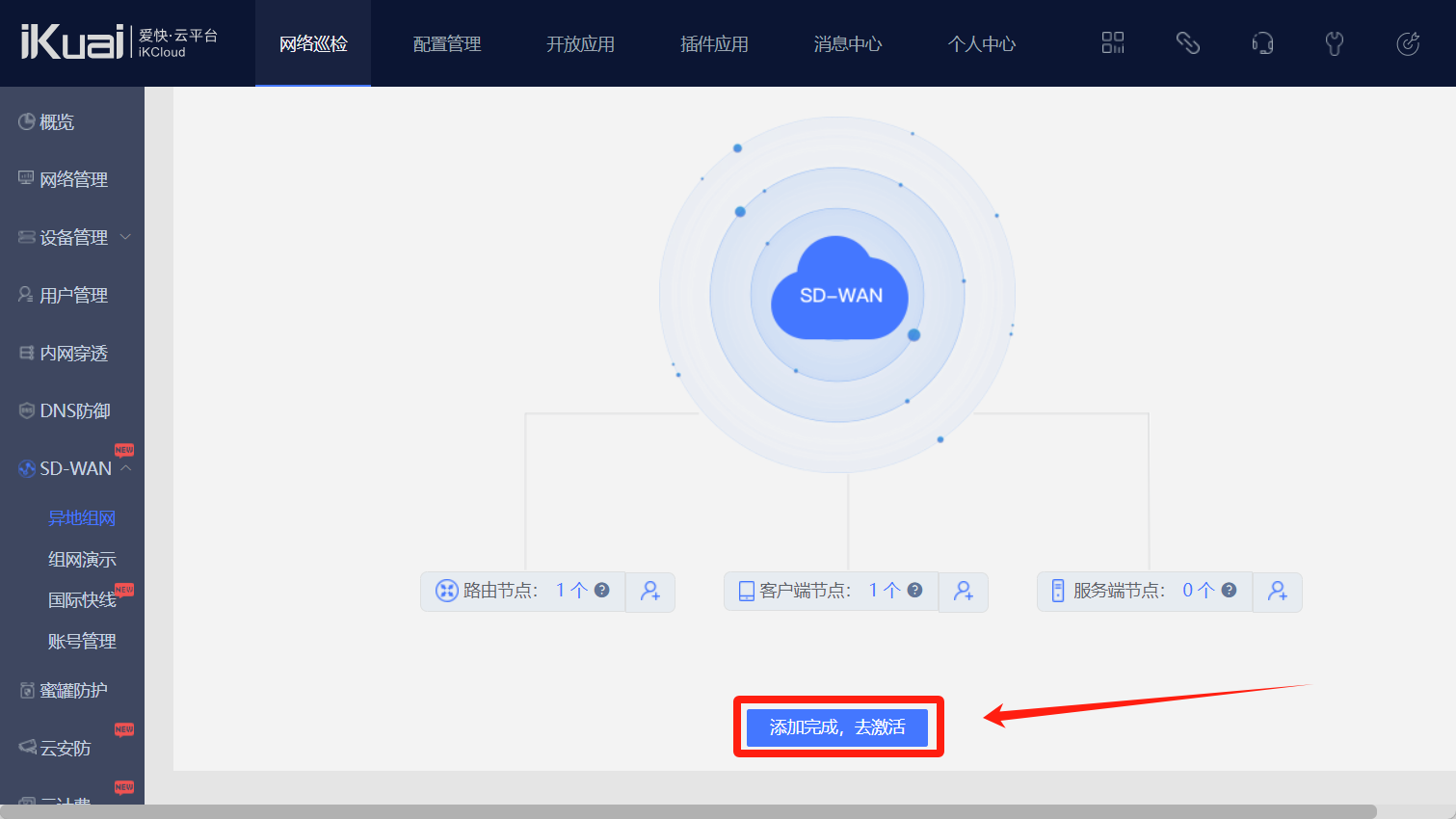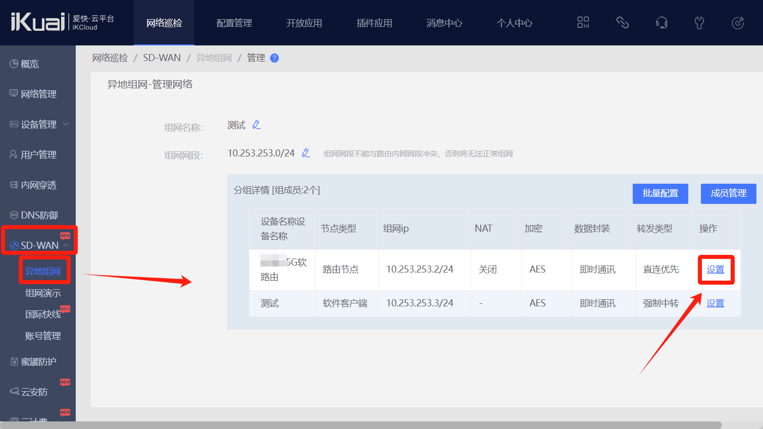 回到爱快云--SD-WAN--异地组网,可以看到已组件的网络,点击管理。