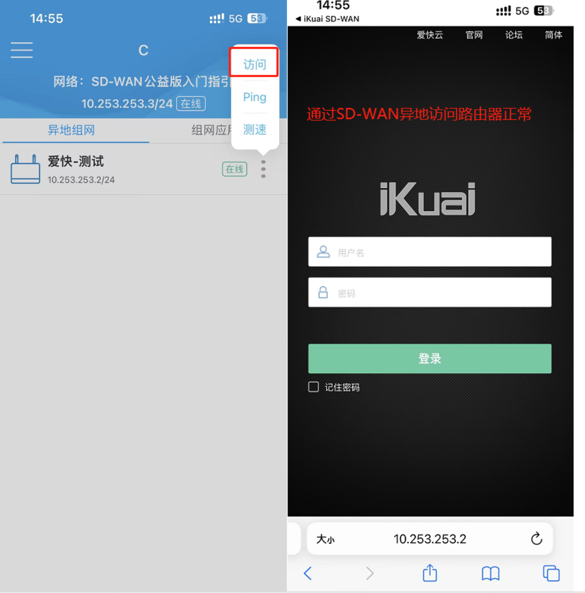 点击访问,稍等一下即可成功连接组网的爱快路由后台。
