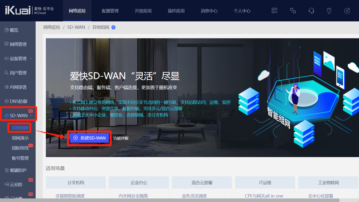 点击SD-WAN--异地组网--新建SD-WAN。