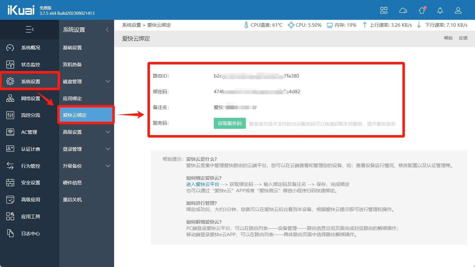 登录爱快路由器后台--系统设置--爱快云绑定,将爱快路由器绑定到爱快云平台。