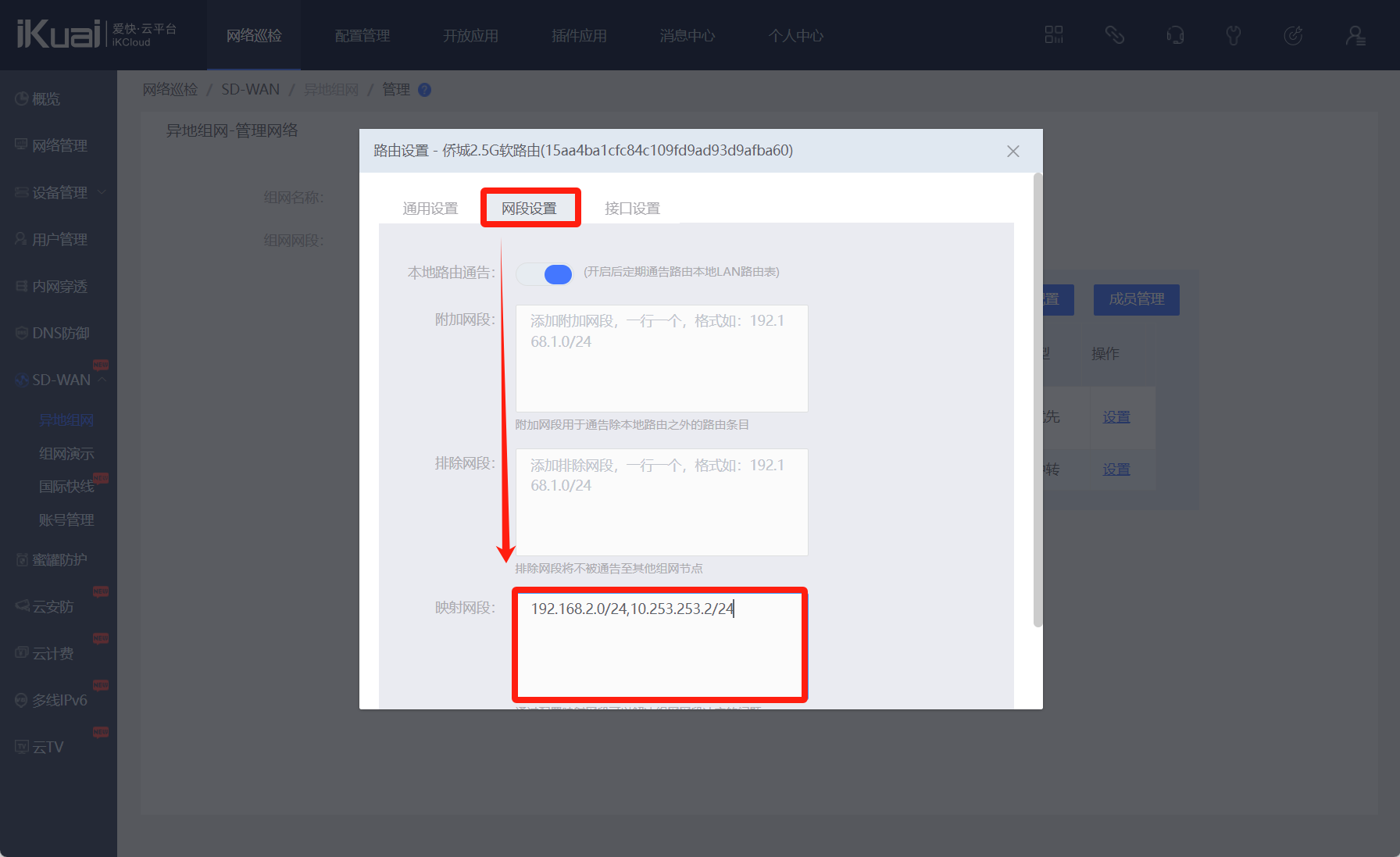 在爱快云--SD-WAN--异地组网--路由节点--设置