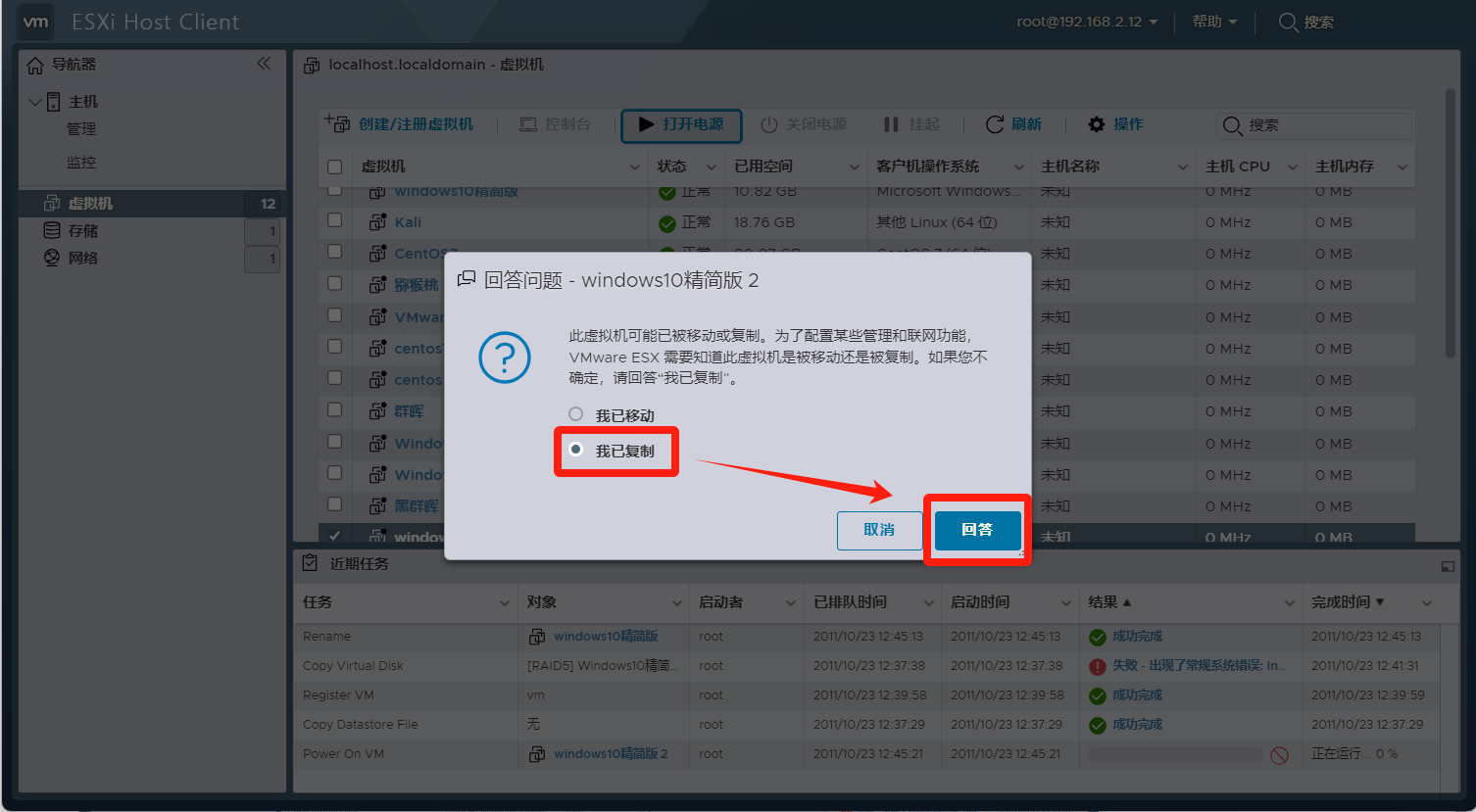 打开克隆的虚拟机,按照提示选择我已复制,然后点击回答。