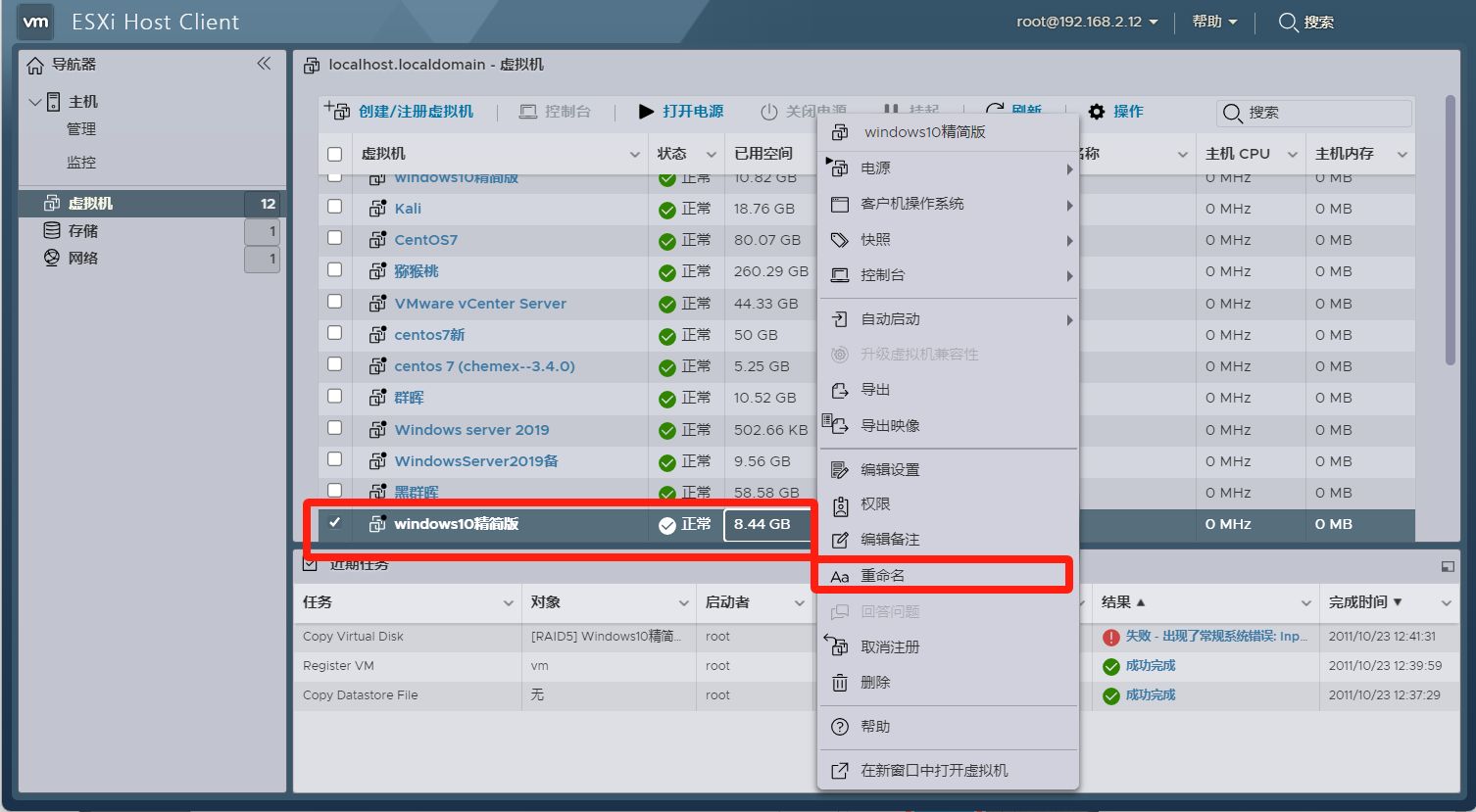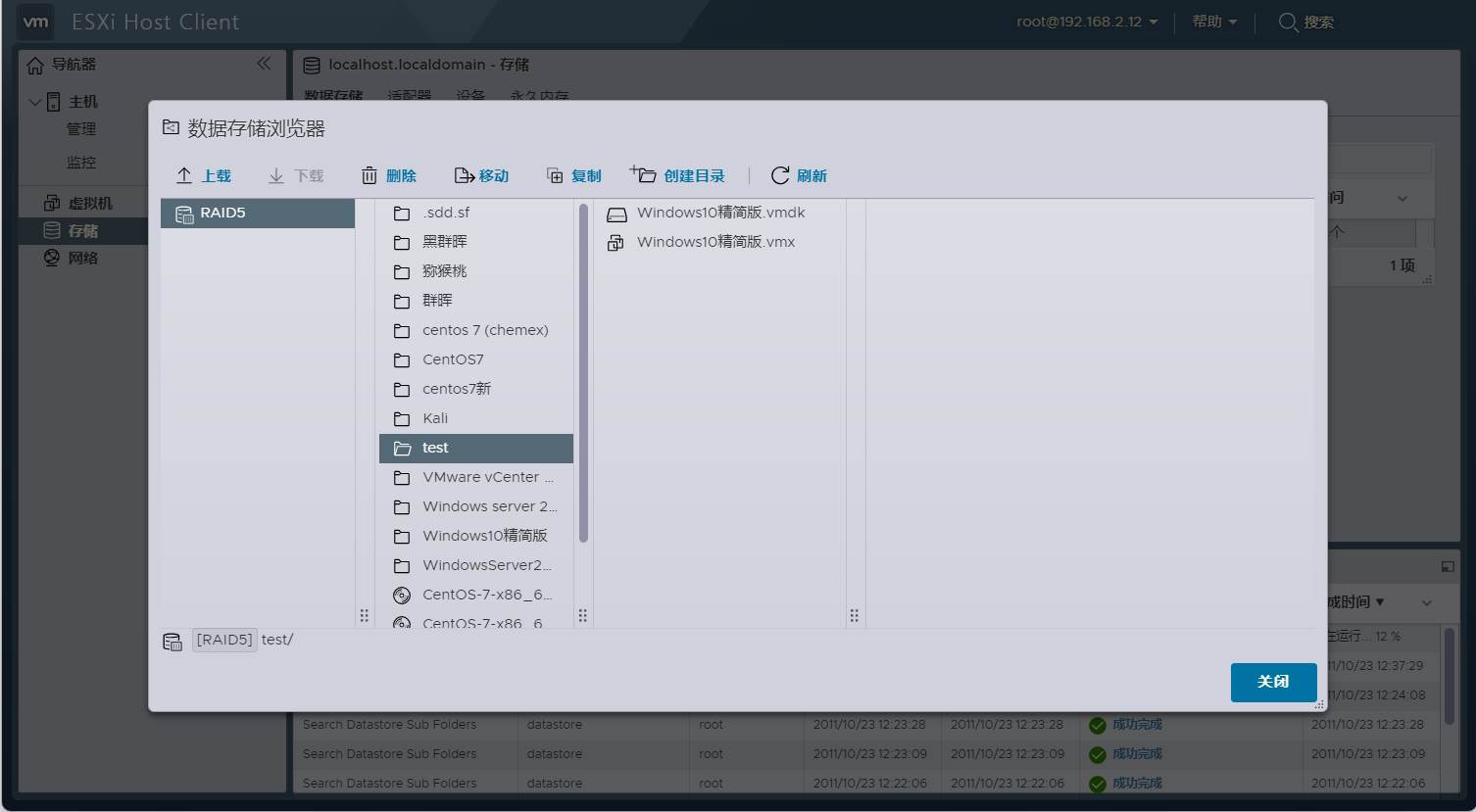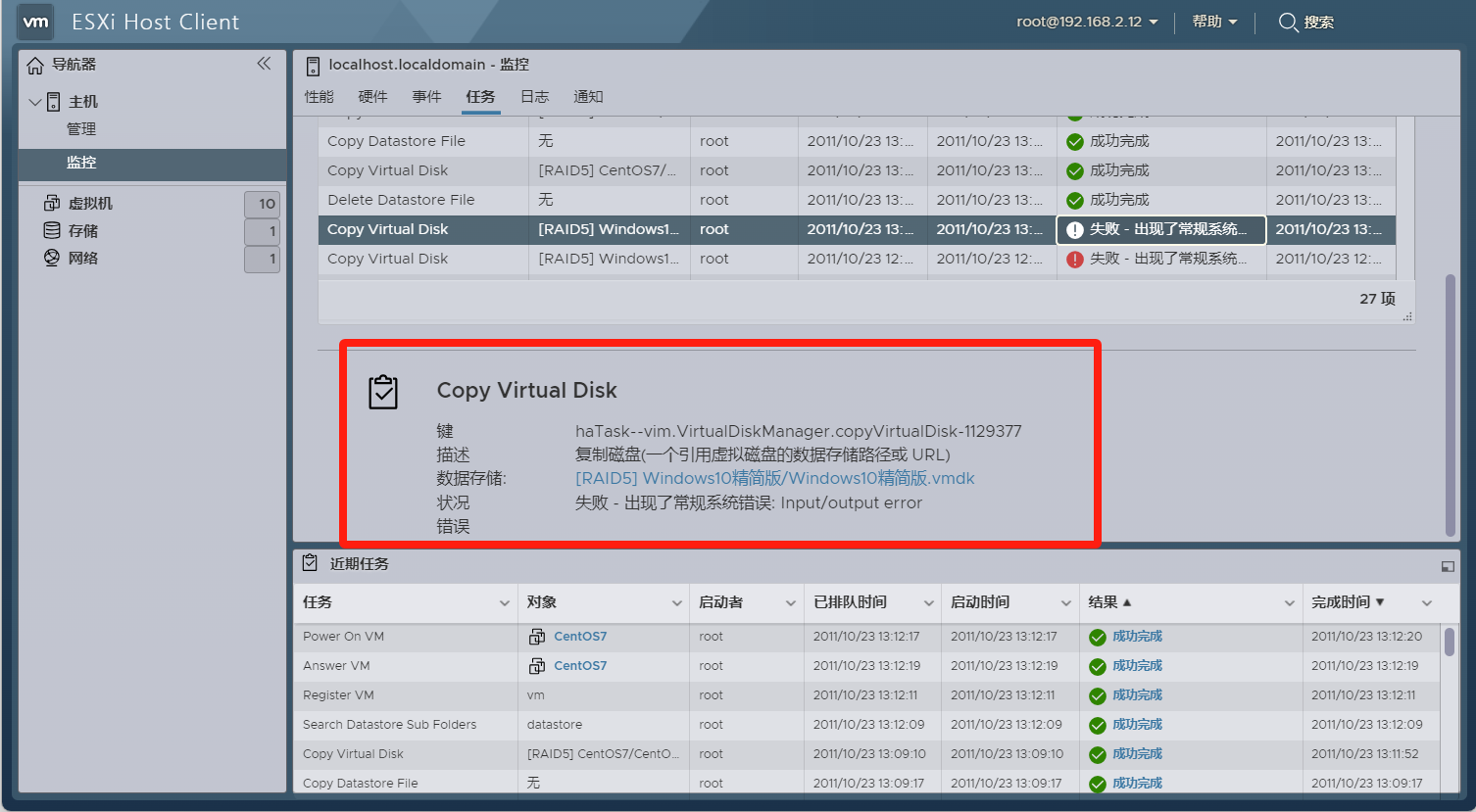 是你的虚拟机文件问题,要么命令连接ESXI复制虚拟机文件,要么换个虚拟机。