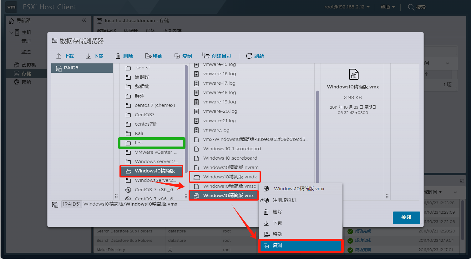 进入需要克隆的虚拟机文件目录内,将所有需要的vmx和vmdk文件都复制到新创建的虚拟机文件目录test内。