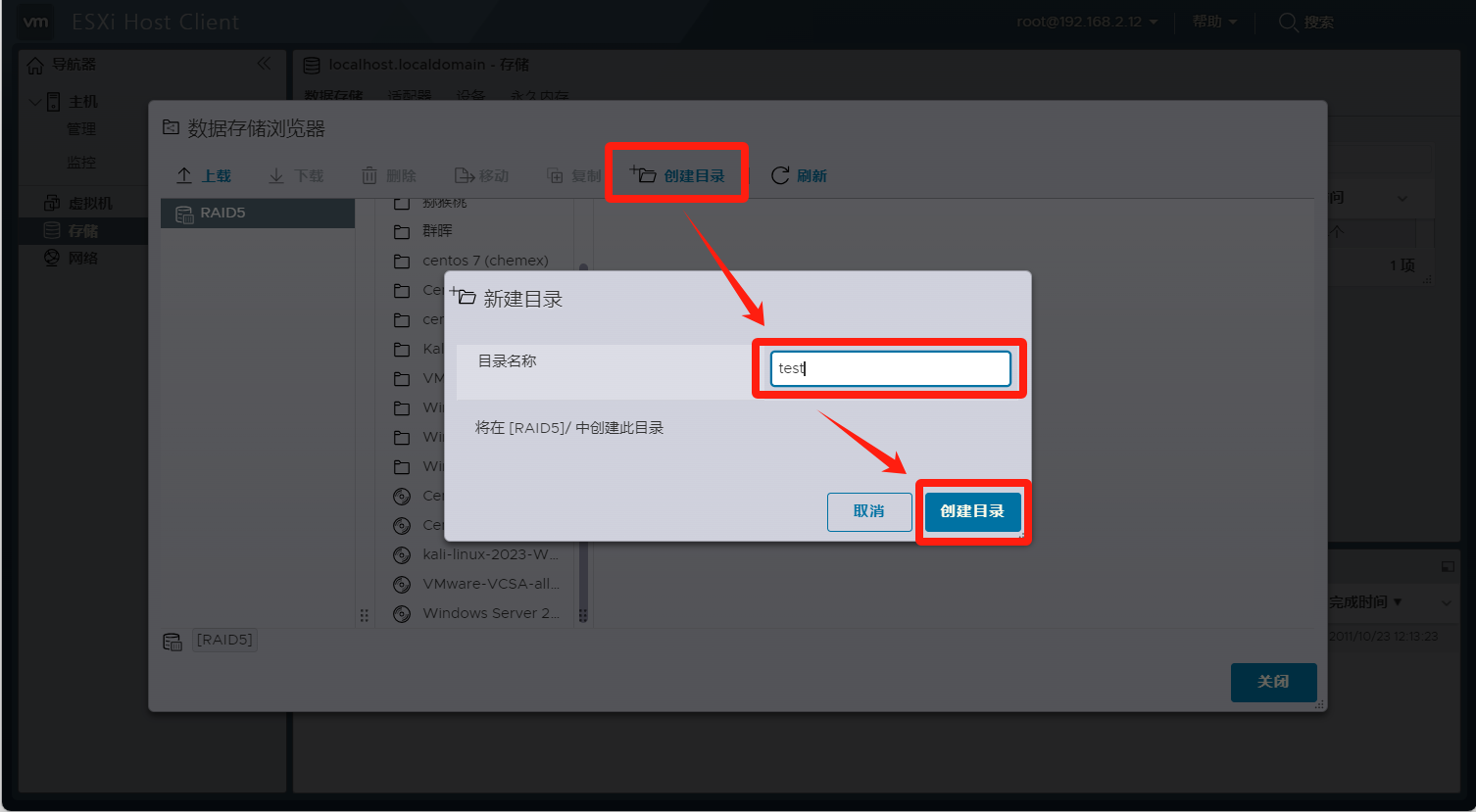 点击创建目录,创建一个存储克隆后的虚拟机的文件夹。
