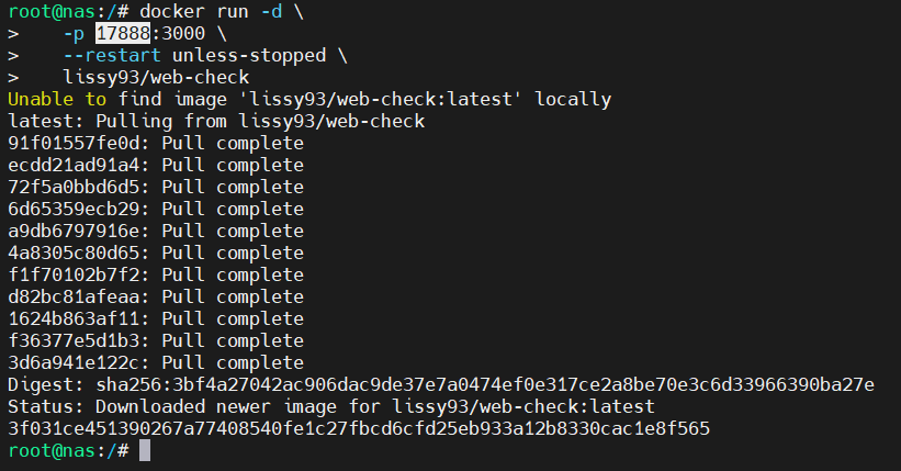 整个镜像3.56G,如果你的网络不好就挂个梯子。docker run -d \ -p 17888:3000 \ --restart unless-stopped \ lissy93/web-check