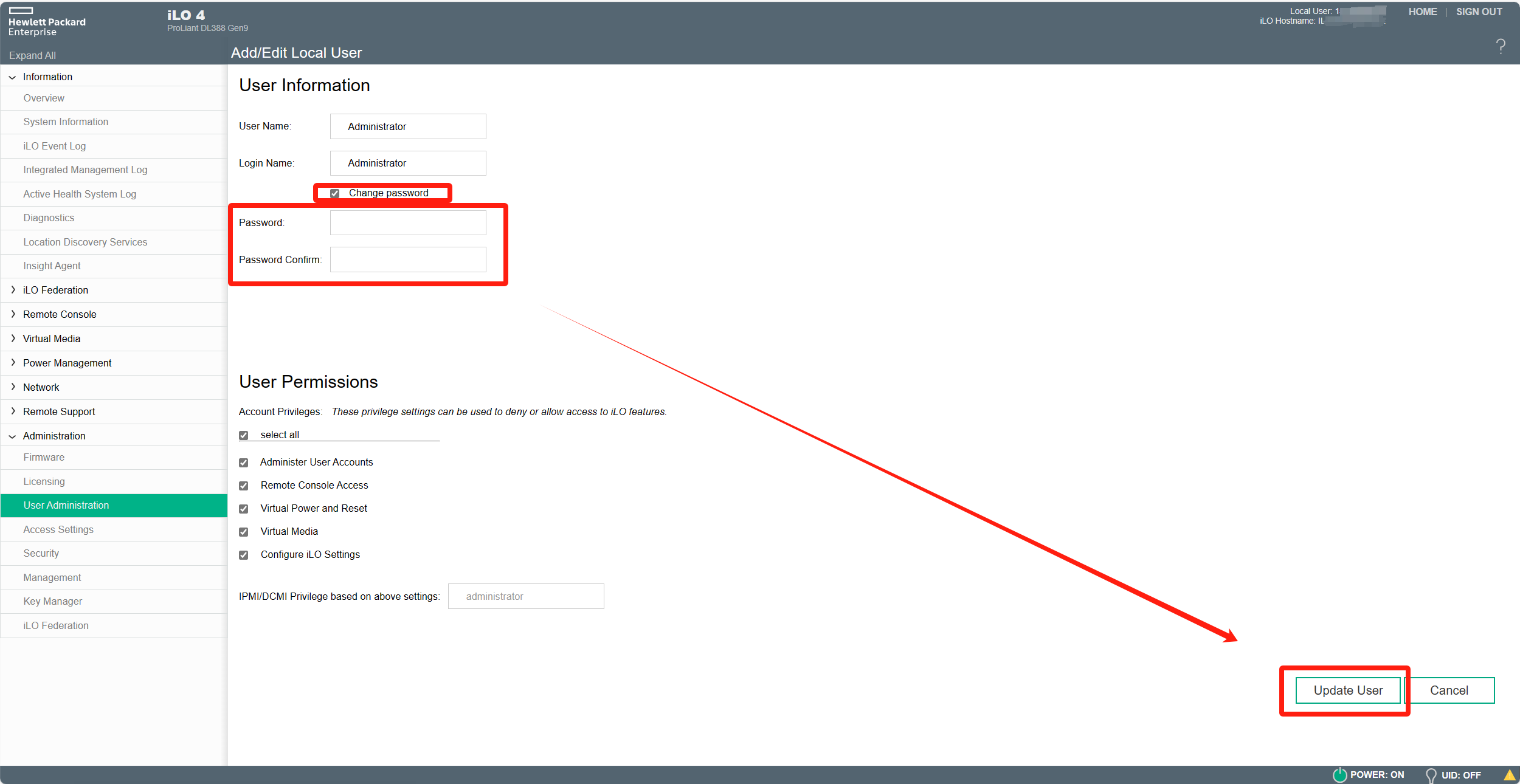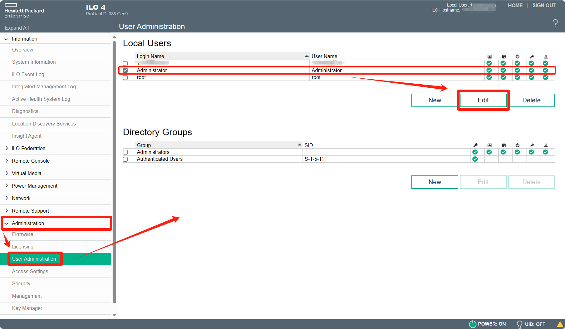 在iLO的Administration--User Administration中,勾选对应账号,点击Edit。