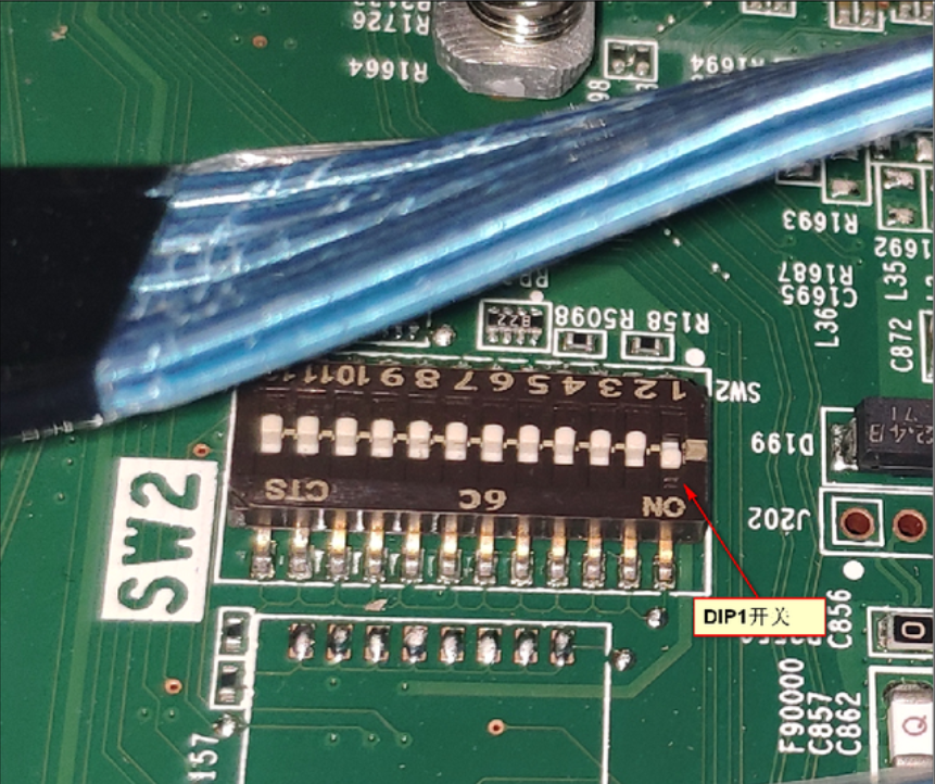 打开服务器盖板,找到拨板位置,拨动主板DIP Switch 1开关。