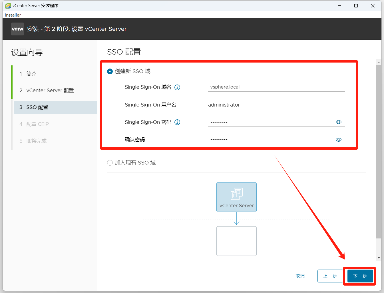 演示安装是初次安装vCenter Server,所以选择创建新的SSO域。