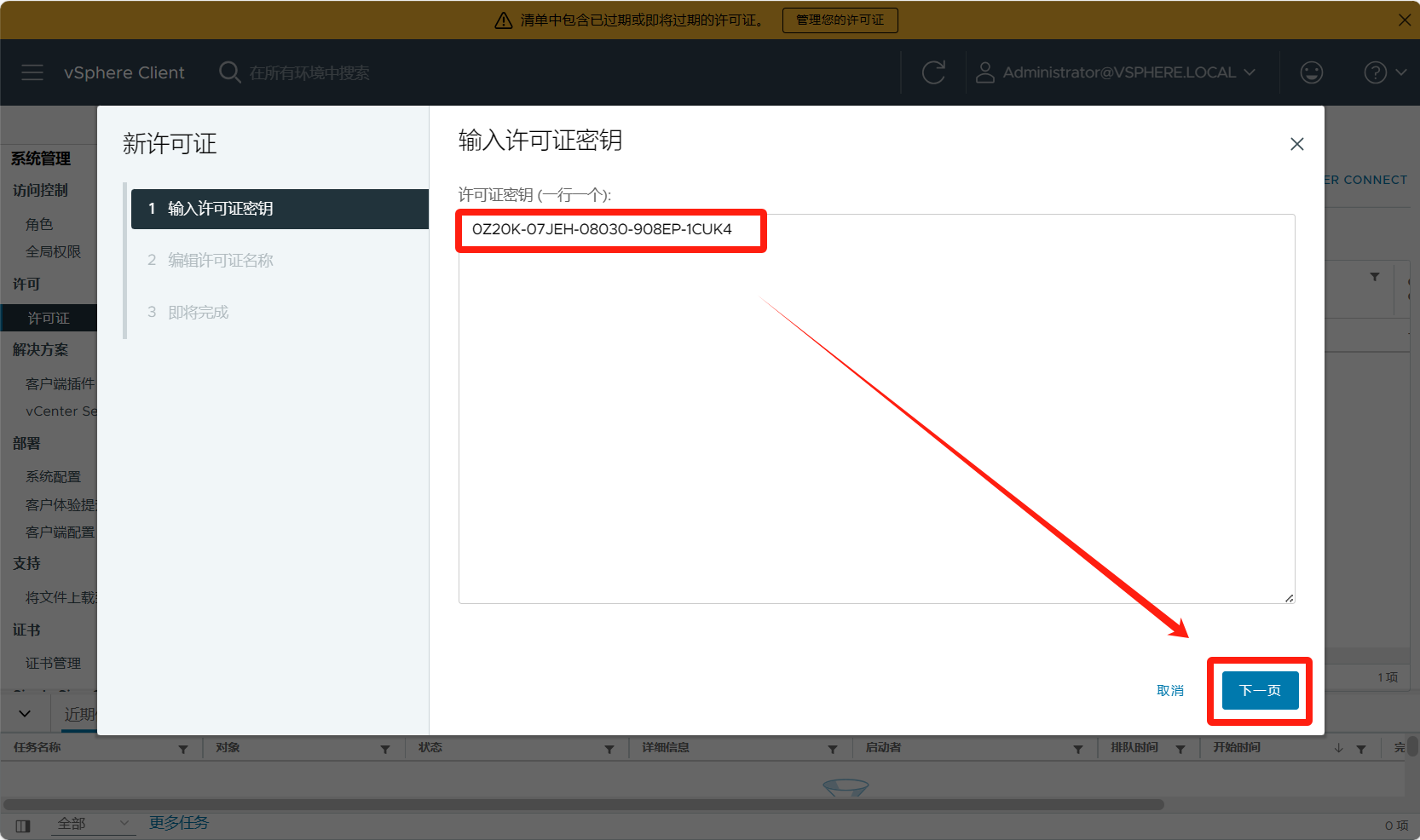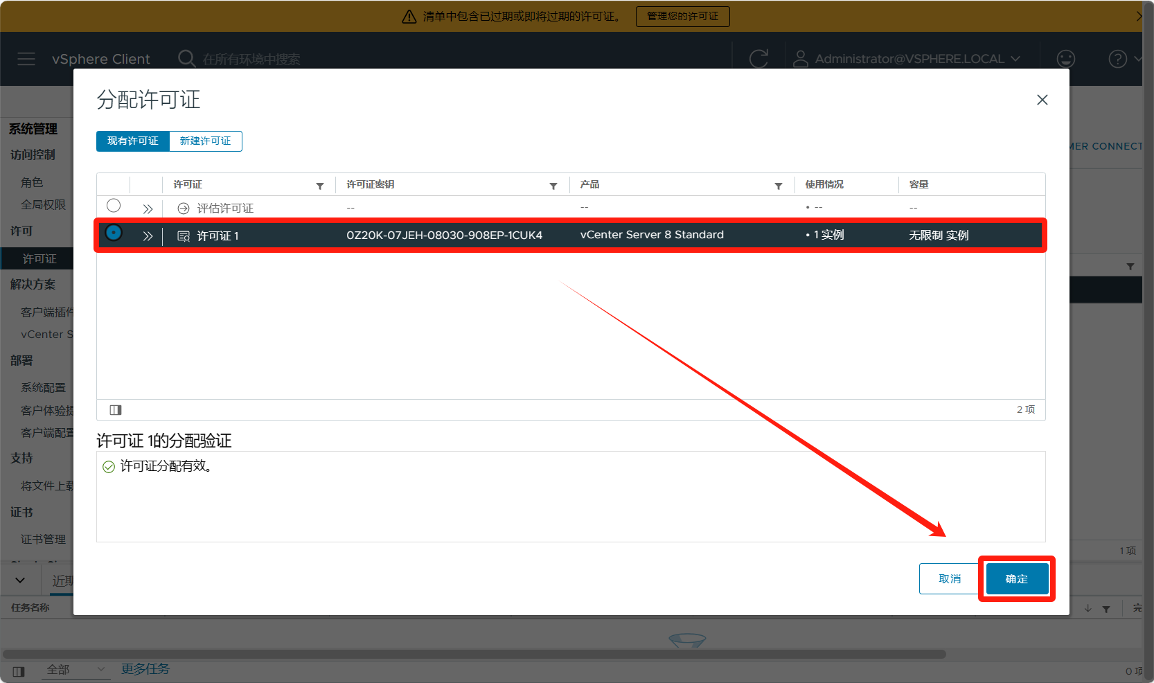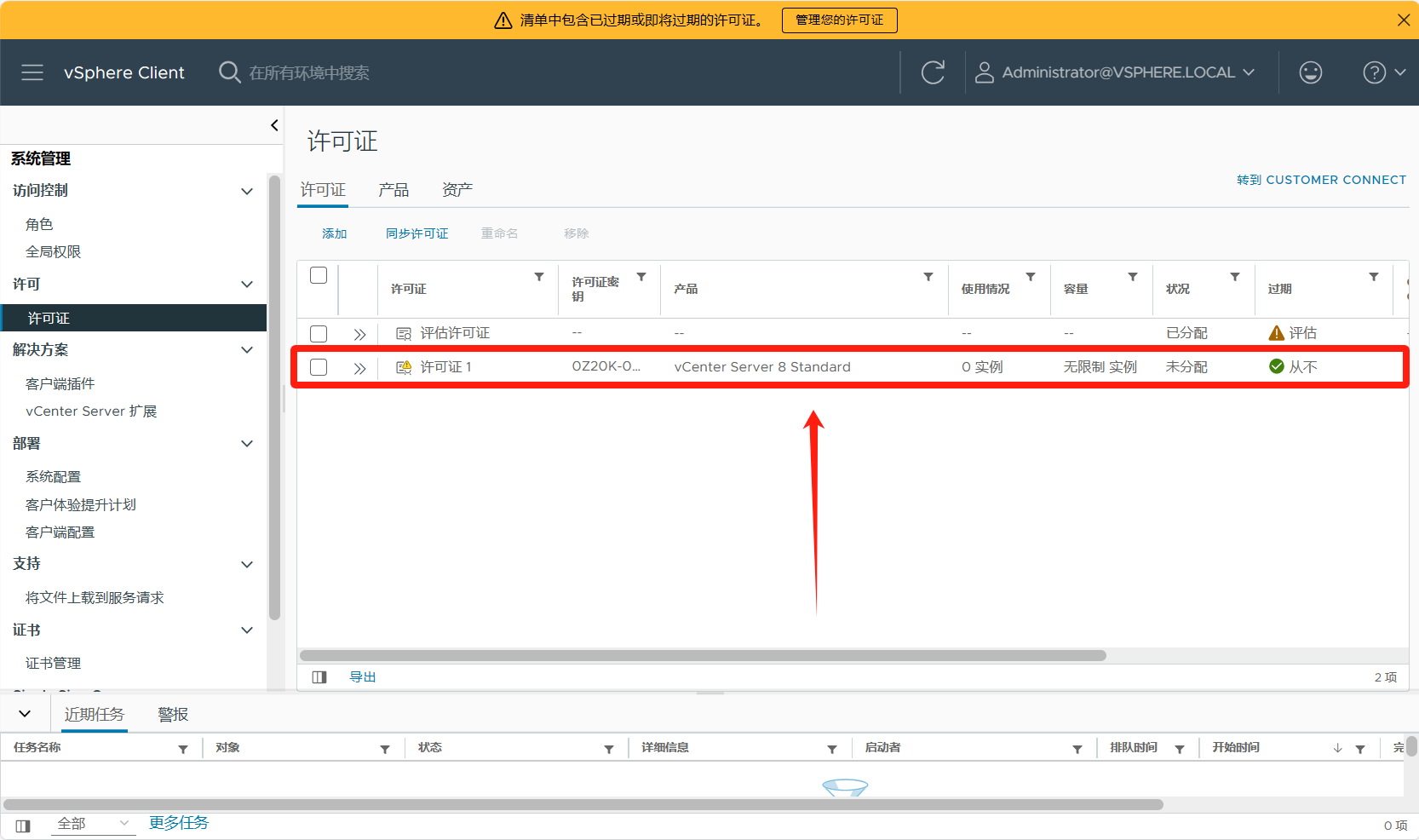(如果你ESXI主机的许可证还没有添加,也可以在这里一行一个添加并备注好许可证名称,后面添加ESXI主机进入vCenter Server时可以直接分配许可证。)#vCenter Server 8 Standard 许可证 0Z20K-07JEH-08030-908EP-1CUK4