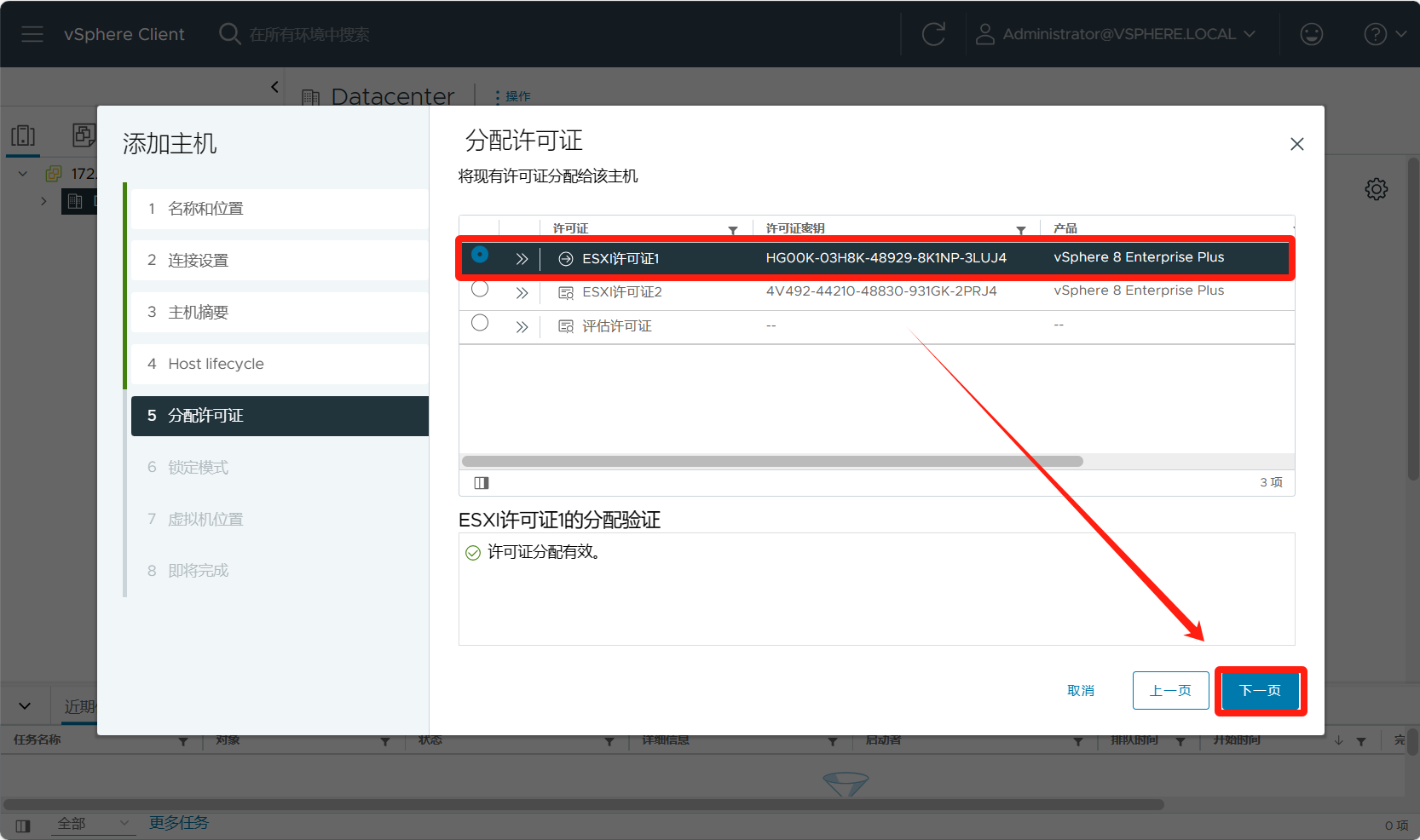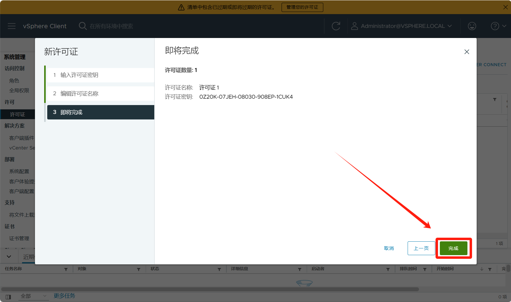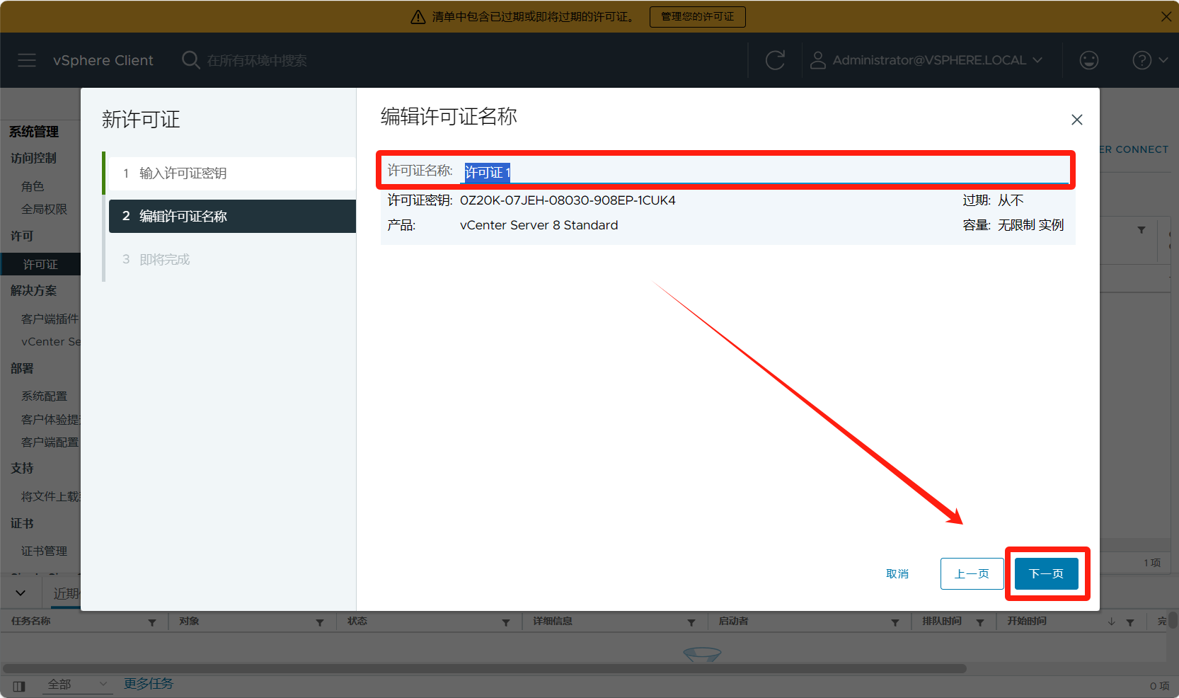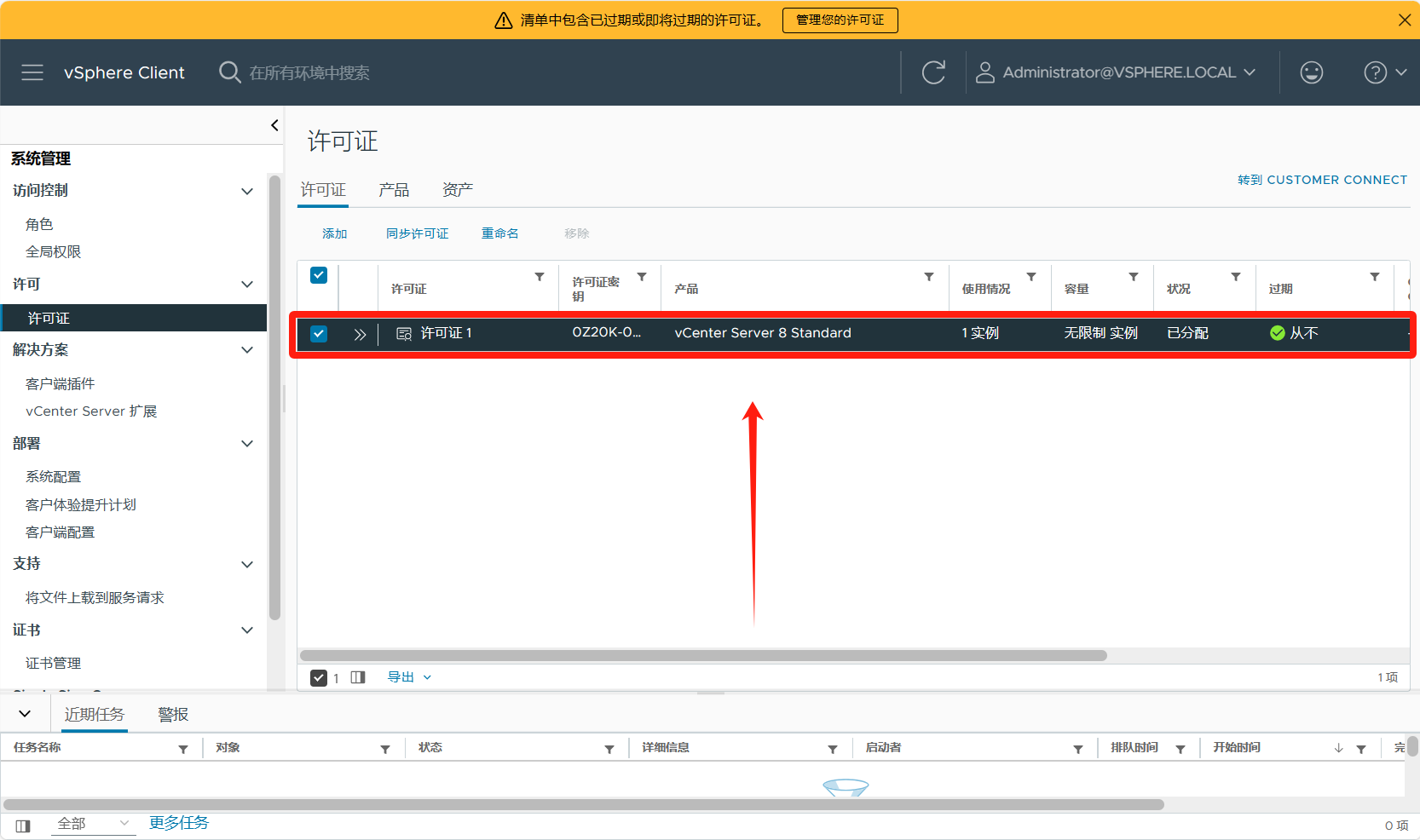 (如果你ESXI主机的许可证还没有添加,也可以在这里一行一个添加并备注好许可证名称,后面添加ESXI主机进入vCenter Server时可以直接分配许可证。)#vCenter Server 8 Standard 许可证 0Z20K-07JEH-08030-908EP-1CUK4