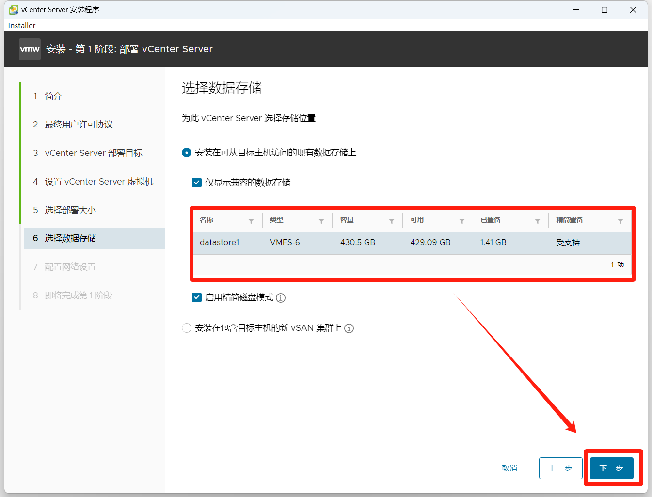 磁盘类型:演示选择的是精简置备(刚创建时占用磁盘空间少,随着使用的增加,磁盘占用会随着一起增加,简单来说就是什么时候用多少就同步占多少。)
