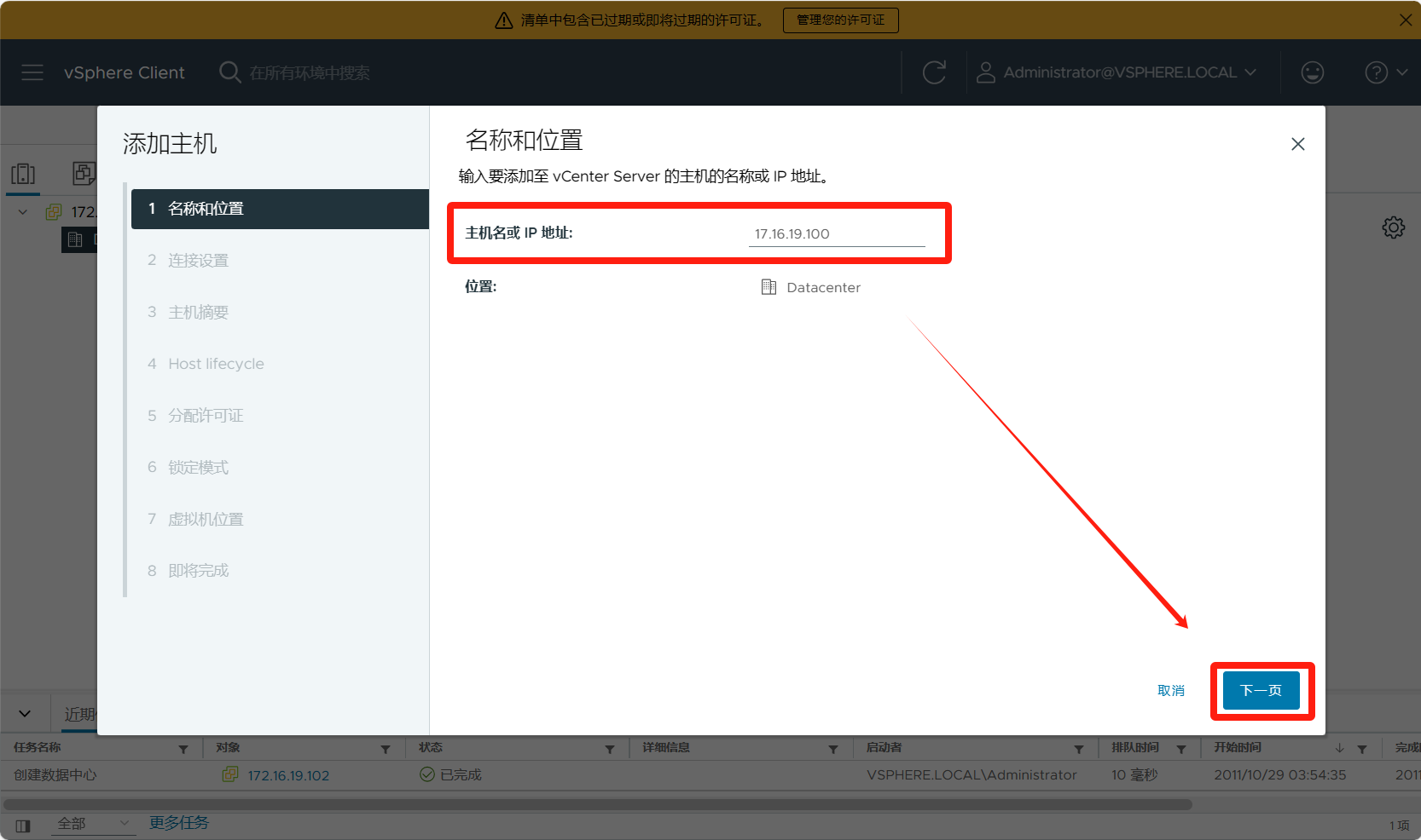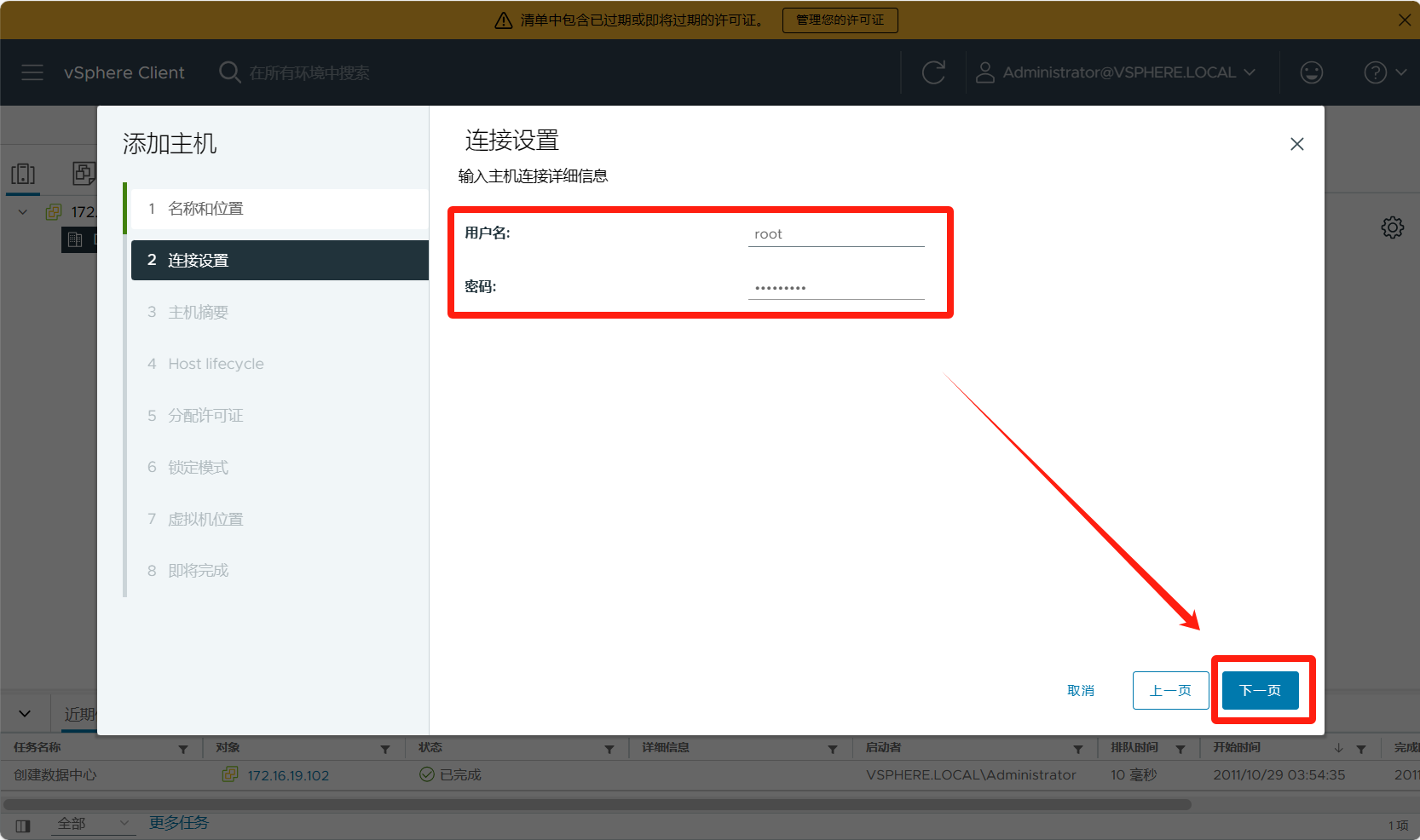 输入你需要添加的ESXI主机名或者IP地址,点击下一步。