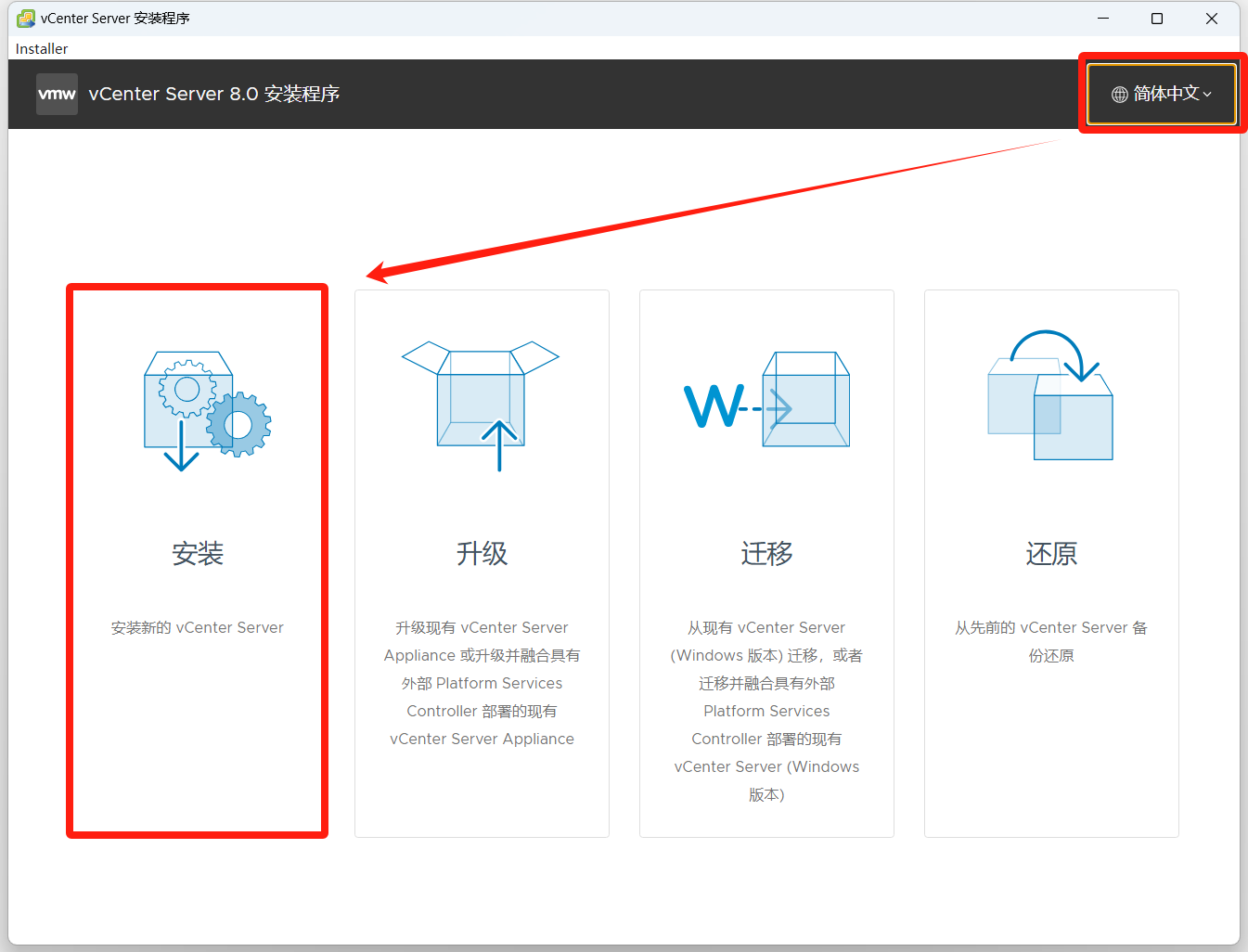 双击打开installer.exe程序,点击右上角选择简体中文语言,点击安装。