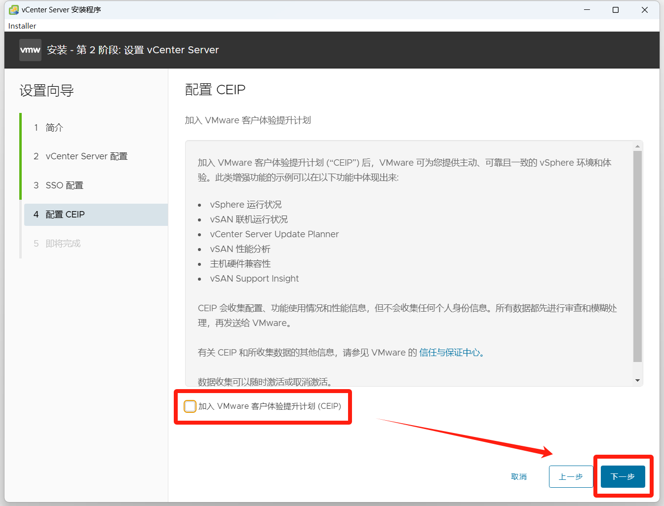 Single Sign-On 域名:vsphere.local(演示使用默认的,如果第一阶段设置了域名,这里也要写前面的设置的域名。)