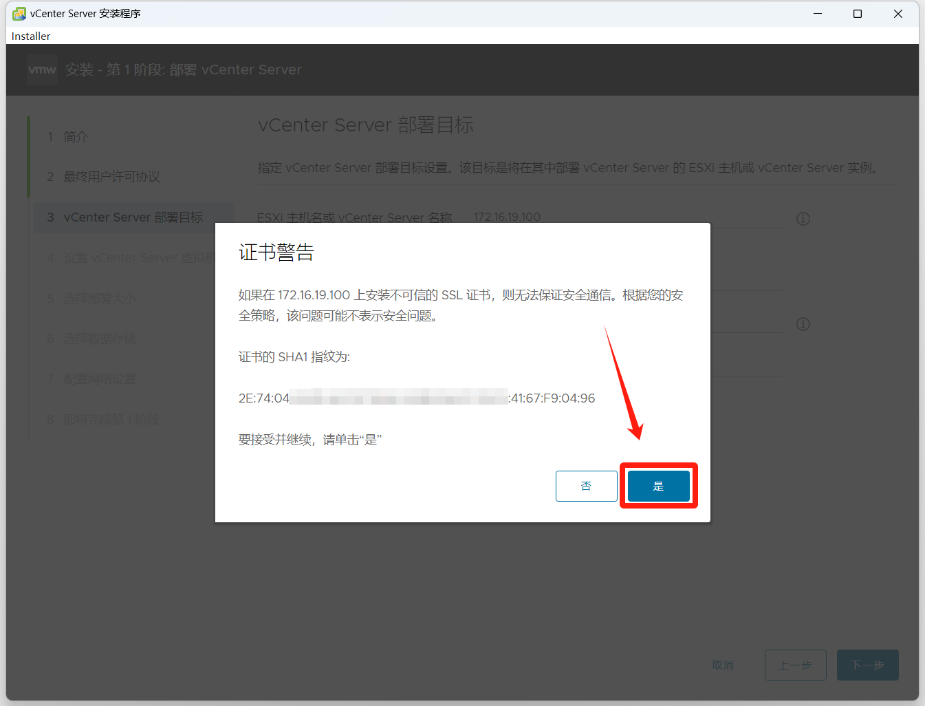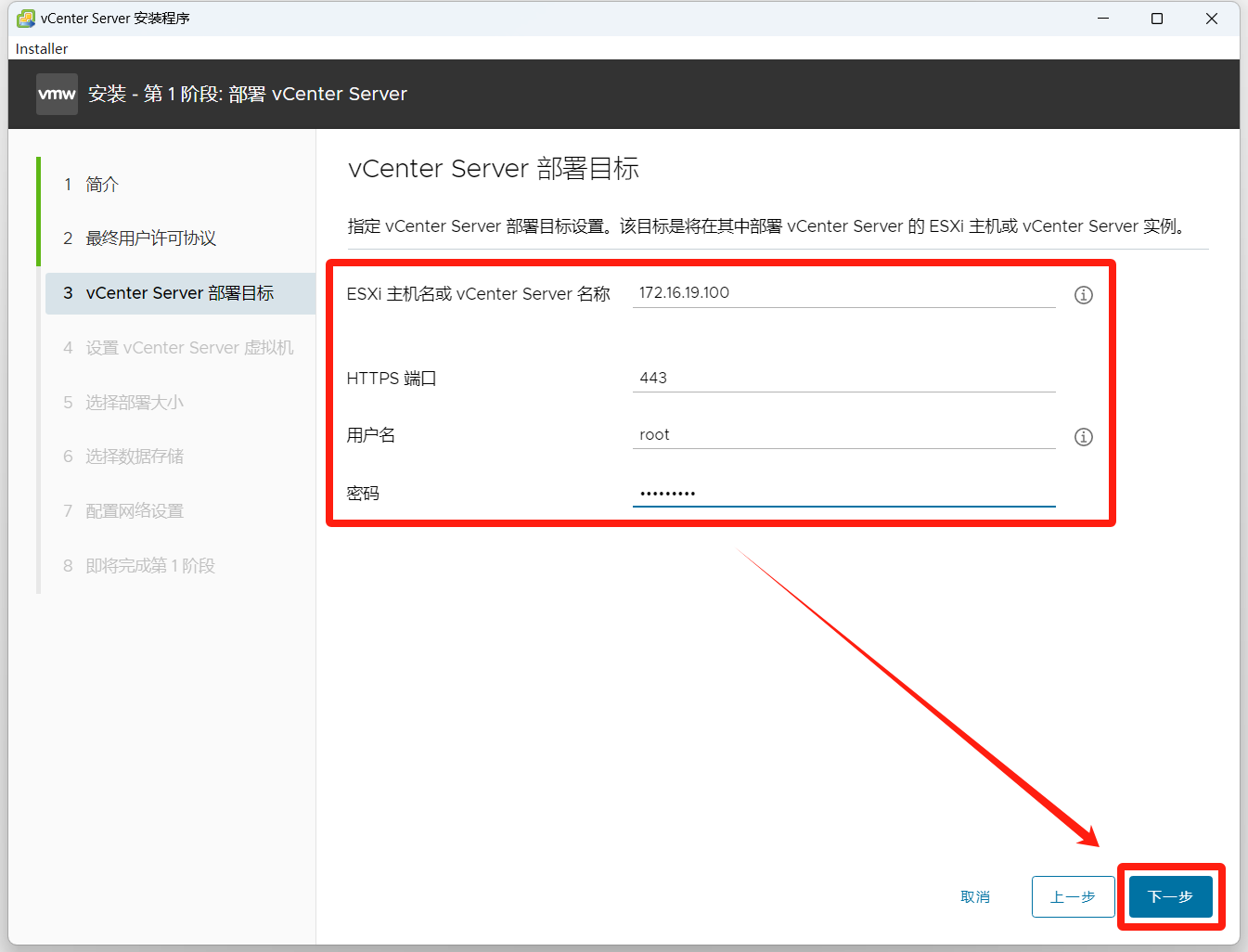 输入目标ESXI主机的信息(提前想好用哪台主机安装vCenter Server)