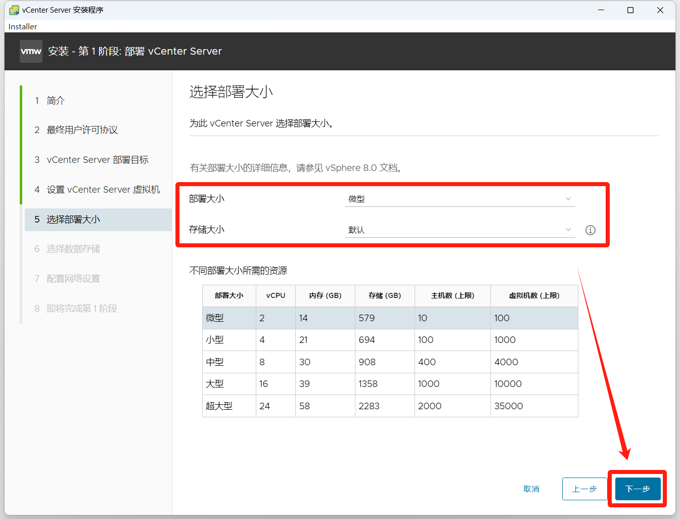 设置vCenter Server虚拟机配置,根据你需求选择虚拟机大小,然后点击下一步。