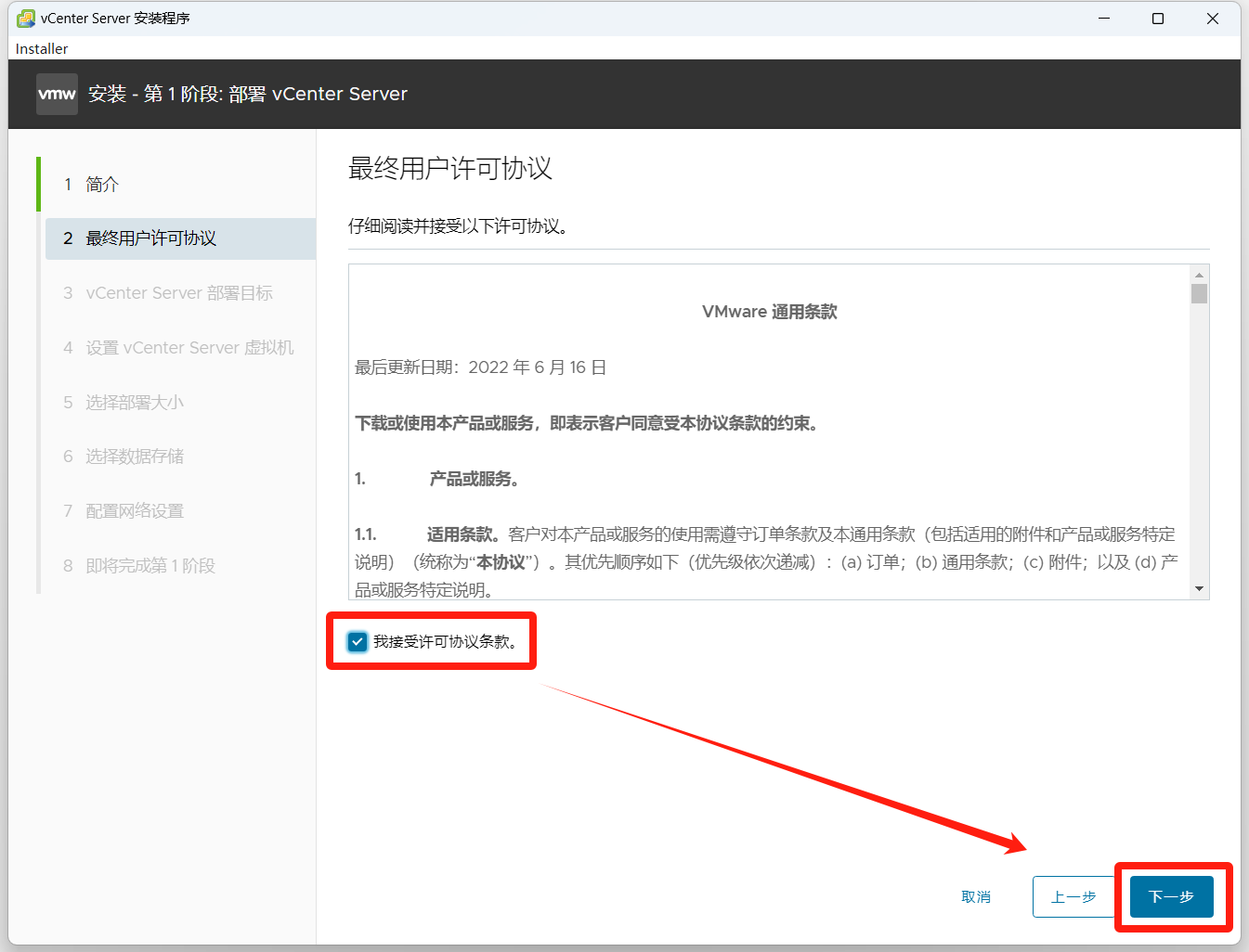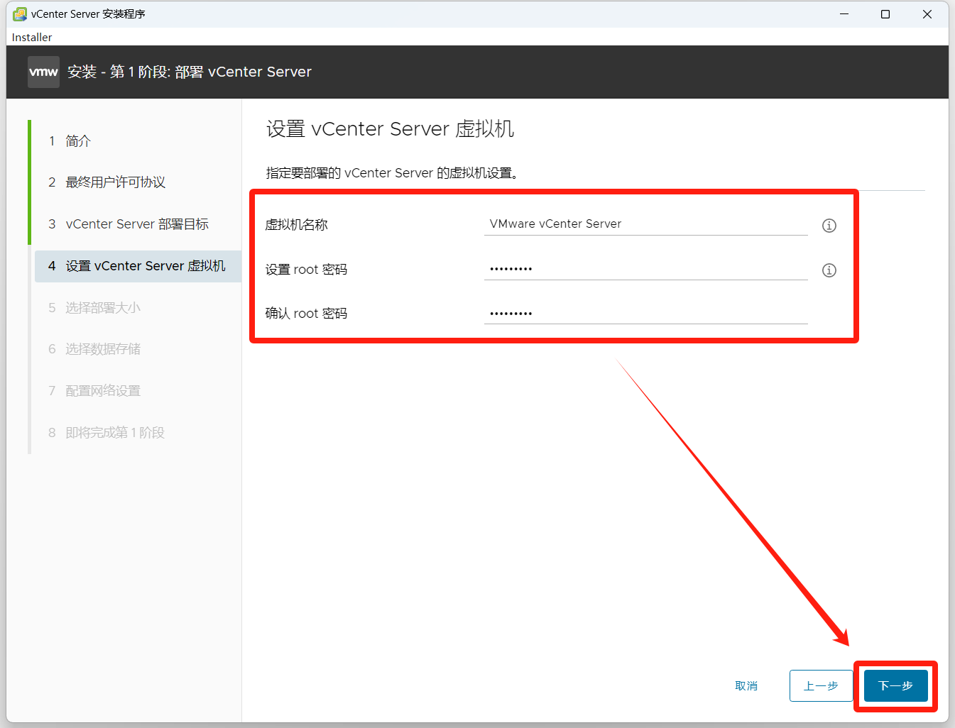 设置vCenter Server虚拟机的名称和root密码,点击下一步。