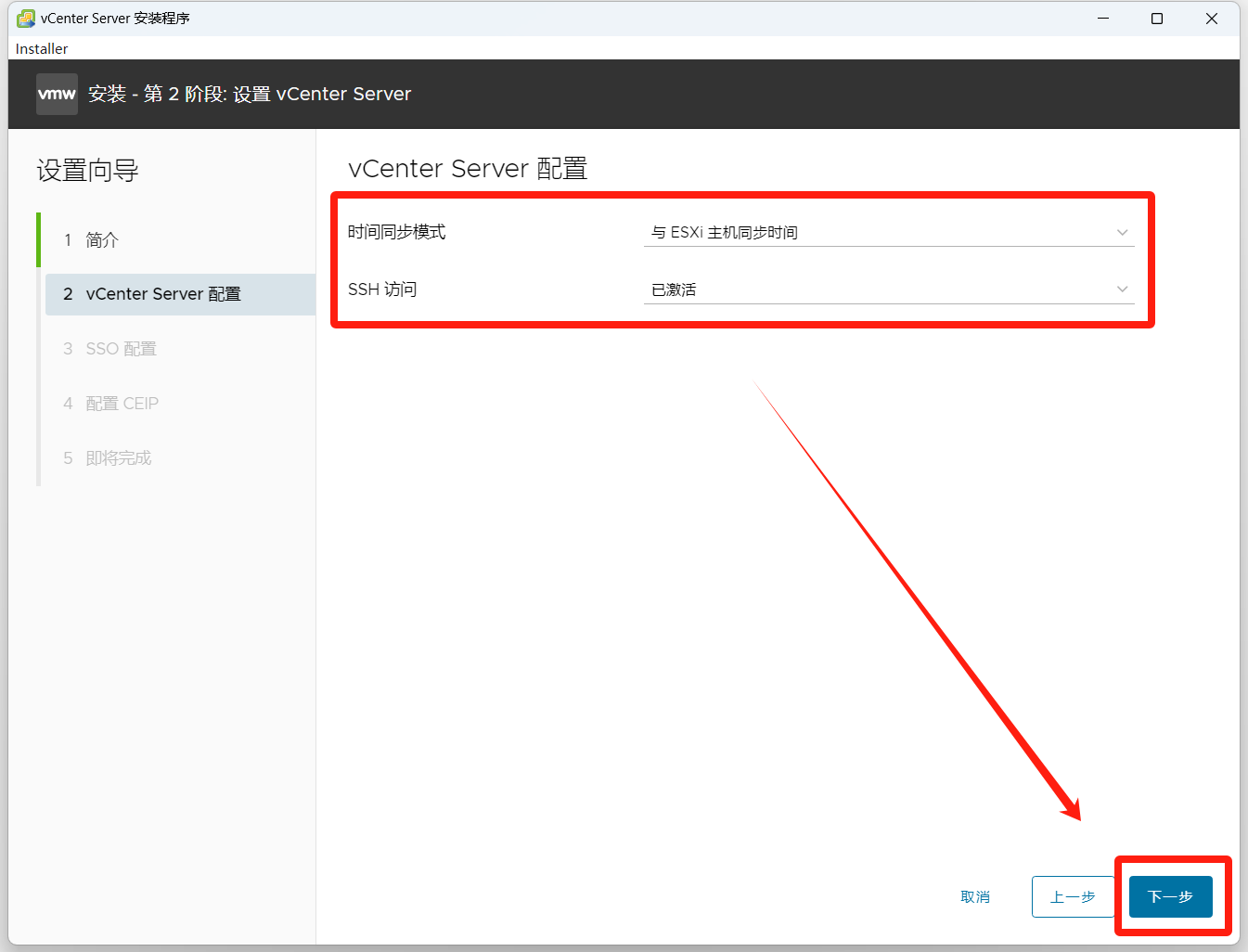 时间同步模式:可选与ESXI主机同步时间,或者与NTP时间服务器同步。