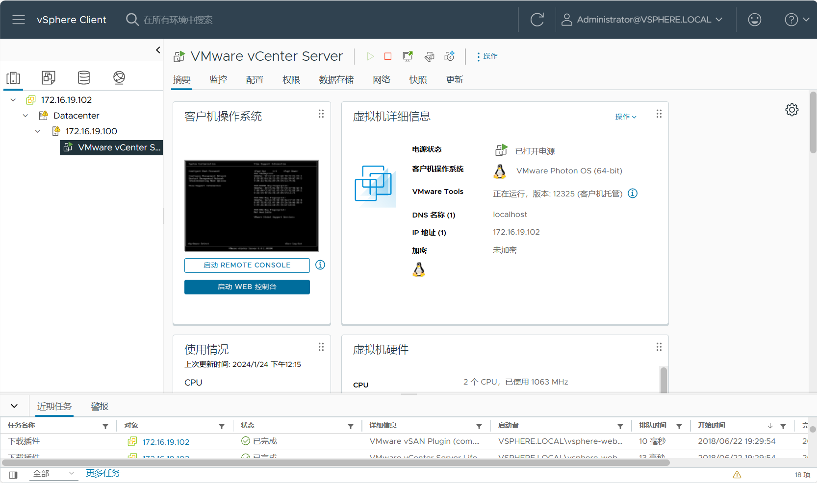 登录vCenter Server时的账号就是administrator@vsphere.local(或者将vsphere.local换成你设置的域名。)