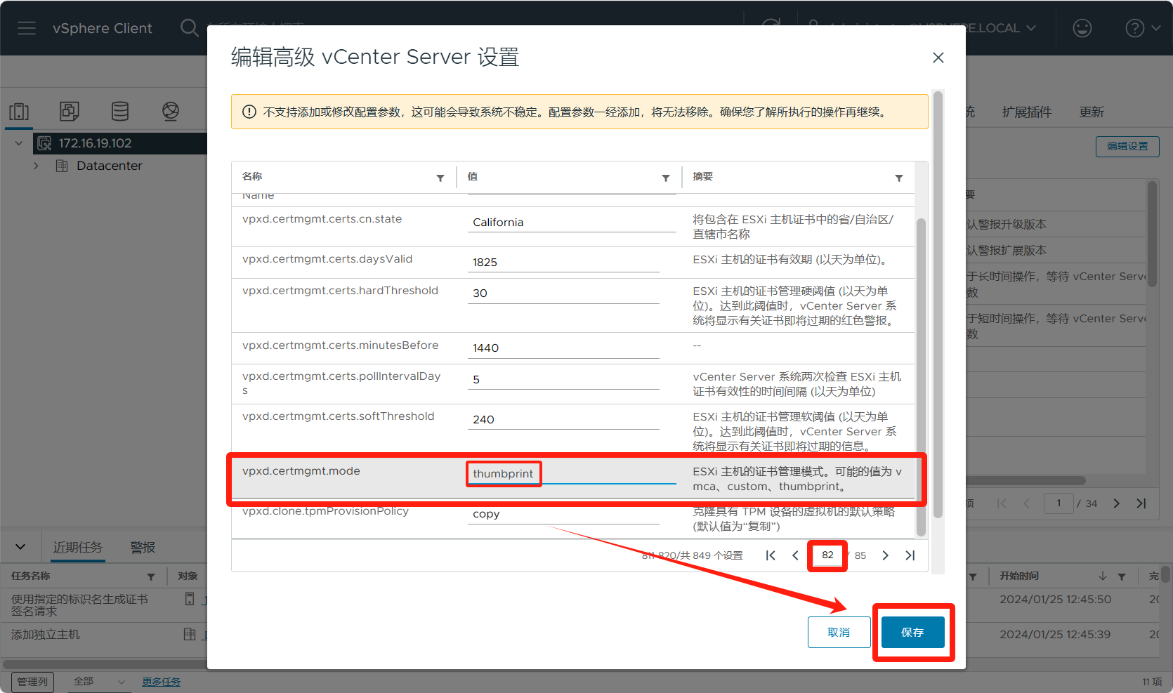 找到第82页的vpxd.certmgmt.mode,将默认的vmca改成thumbprint,然后点击保存,无需重启,重新添加ESXI主机。