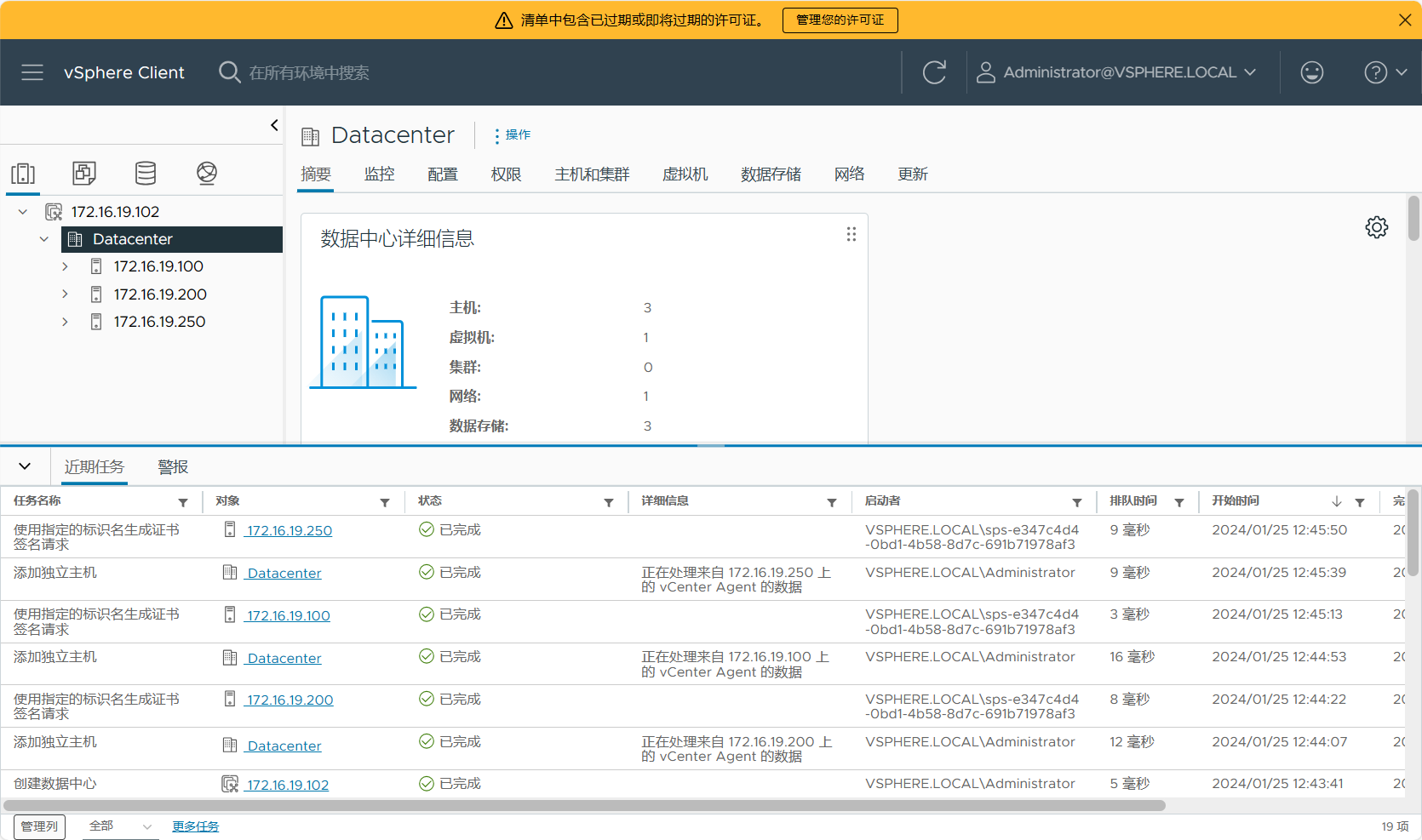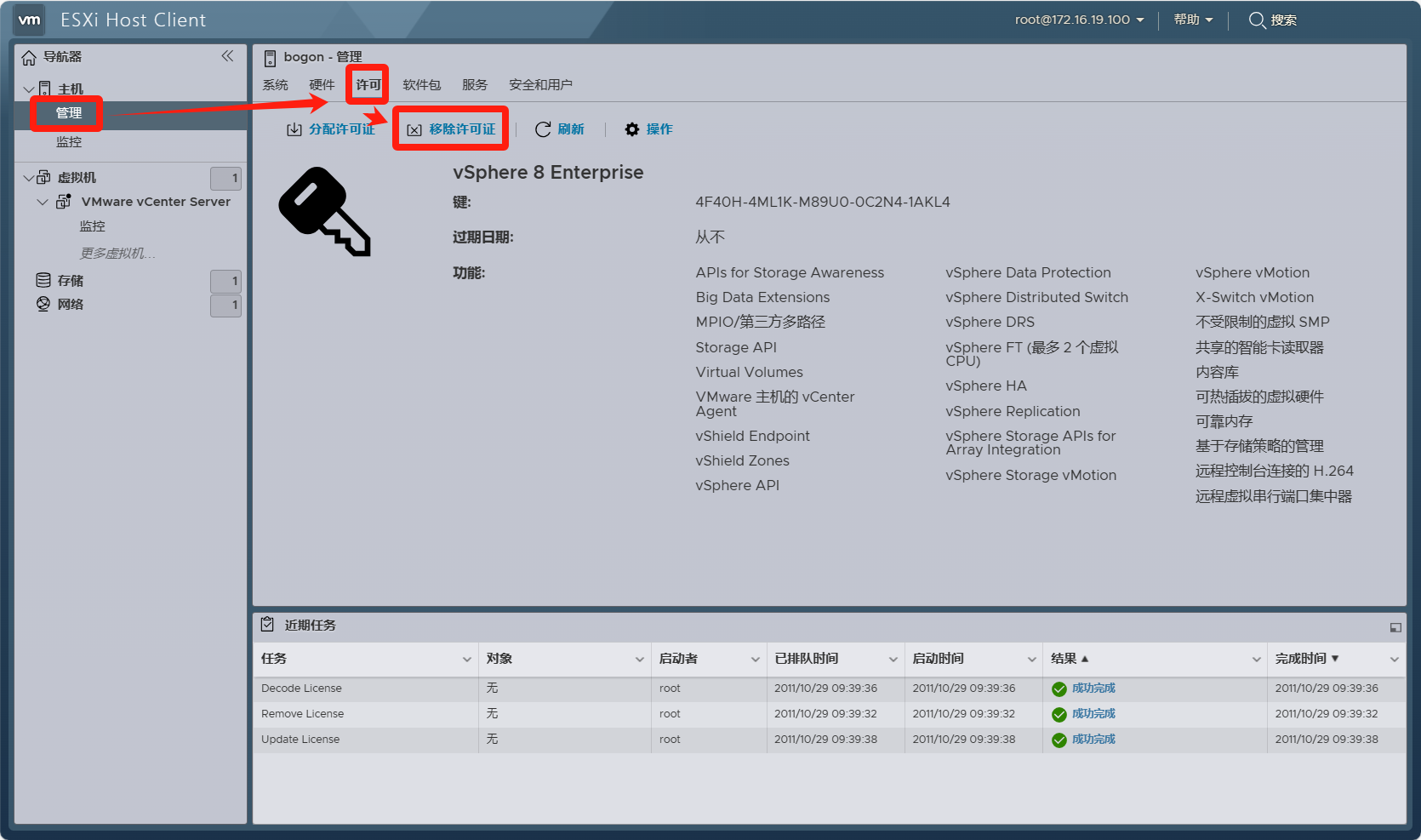 在许可上移除现有许可证,重新添加新的许可证,然后重启ESXI主机查看新的证书到期日期。