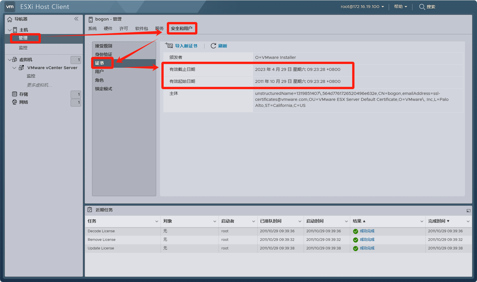 在无法添加到vCenter Server的ESXI主机上--管理--安全和用户--证书,查看证书到期时间。