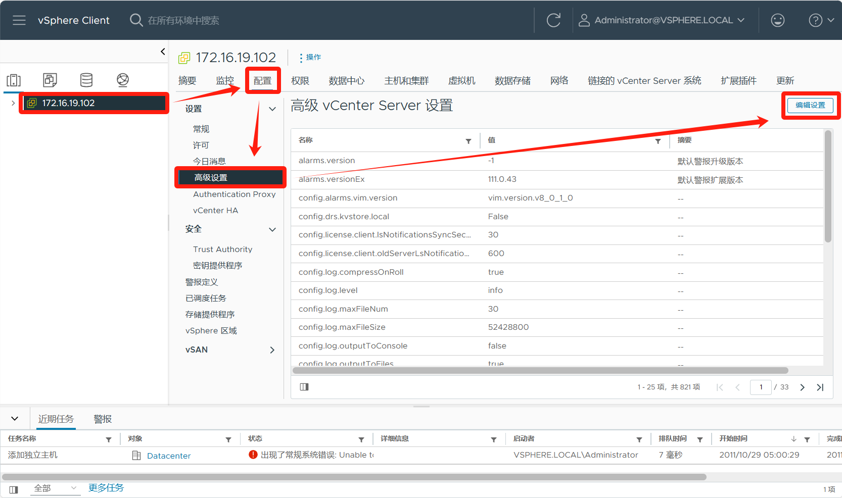 点击vCenter Server主机--配置--高级设置--编辑设置。
