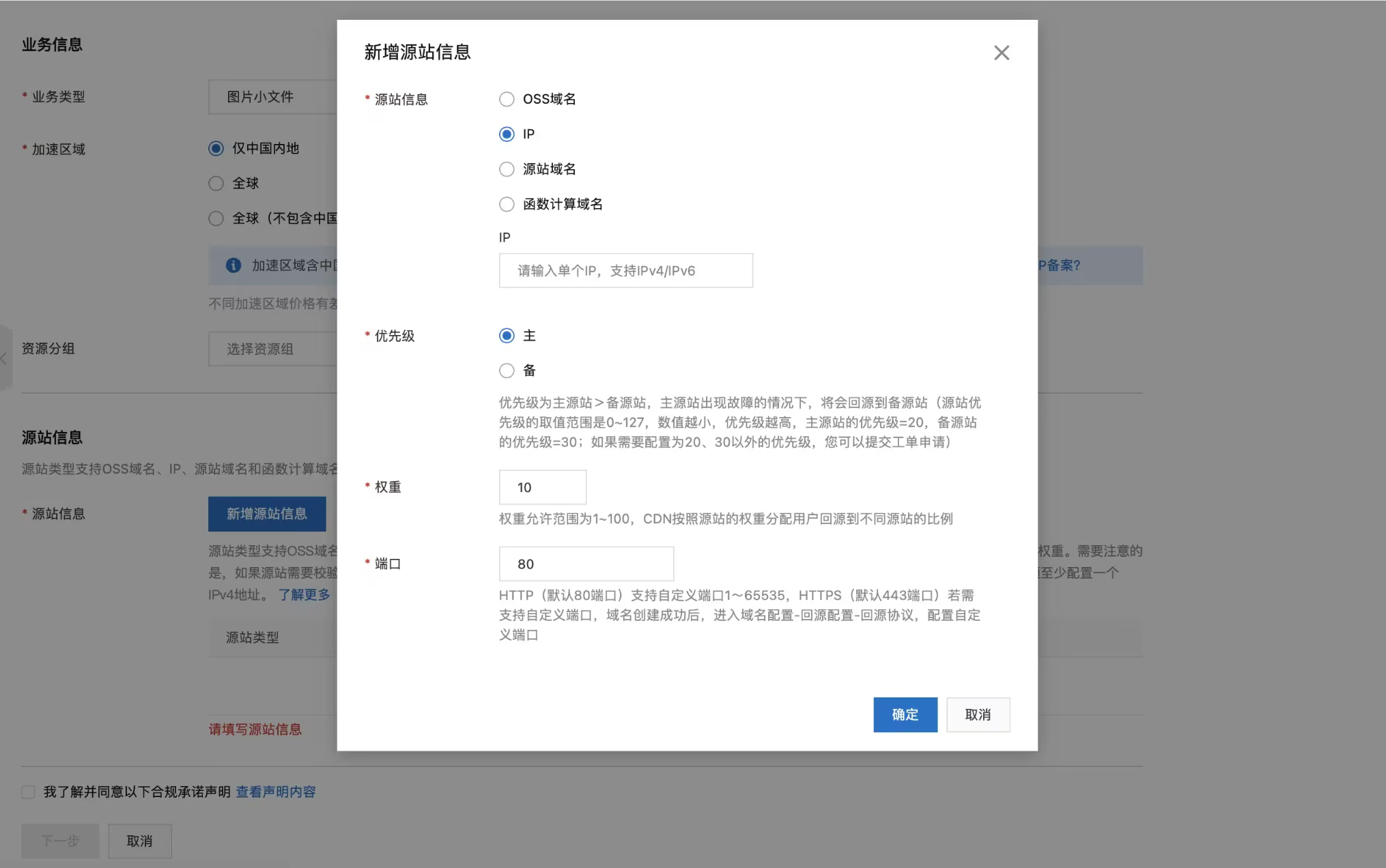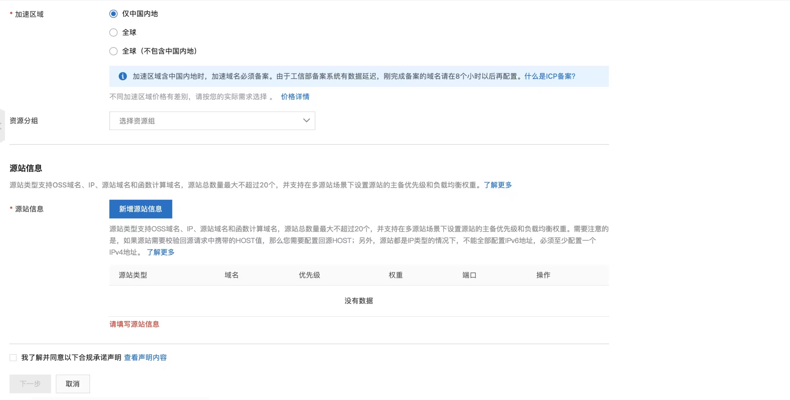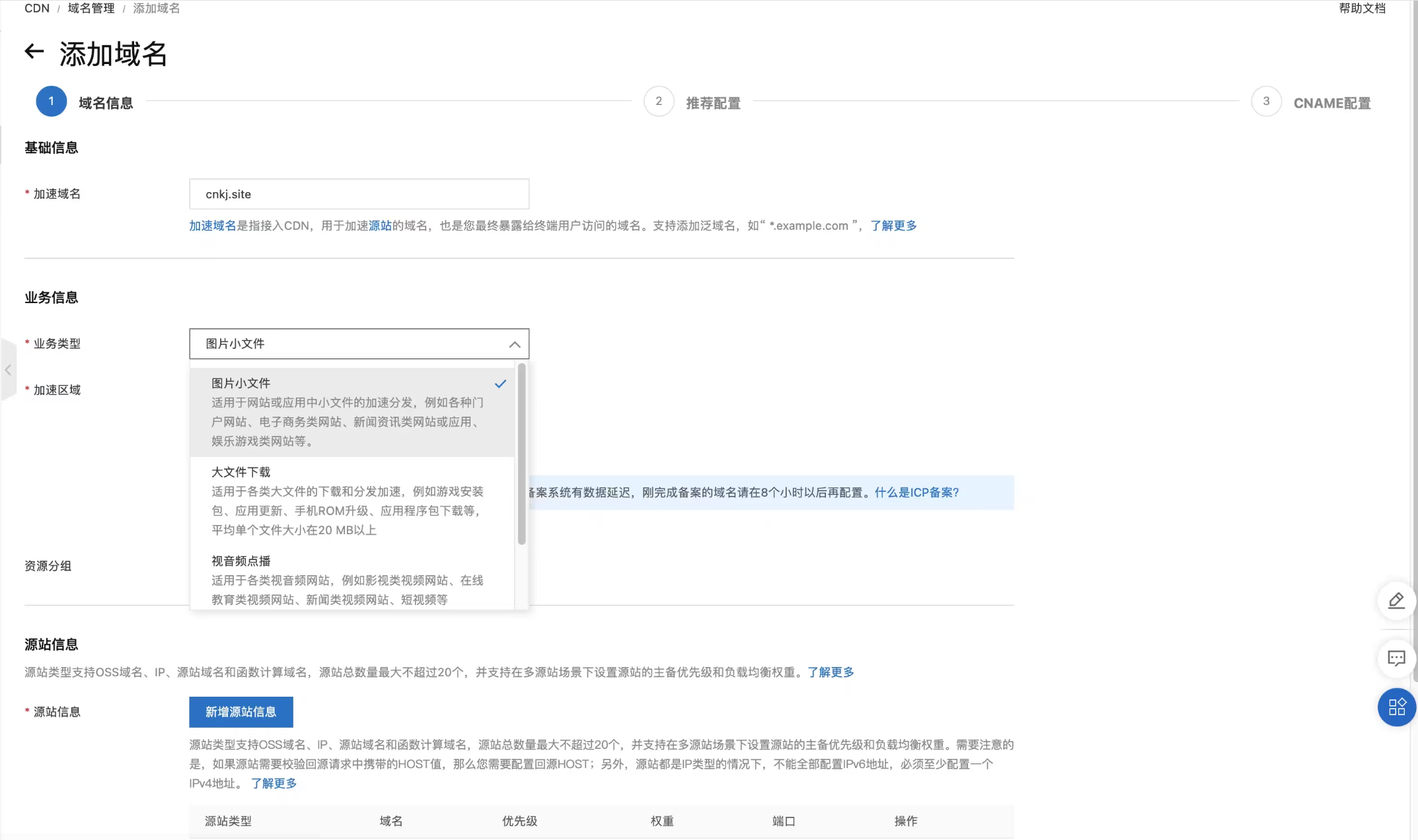 添加“源站”,这个很重要,加速文件的内容的来源,通常我们会把小文件等都放在OSS中,因为我的是家庭NAS做的转发,所以我使用的是域名源站。一般为了访问效果还是建议使用云服务存储。