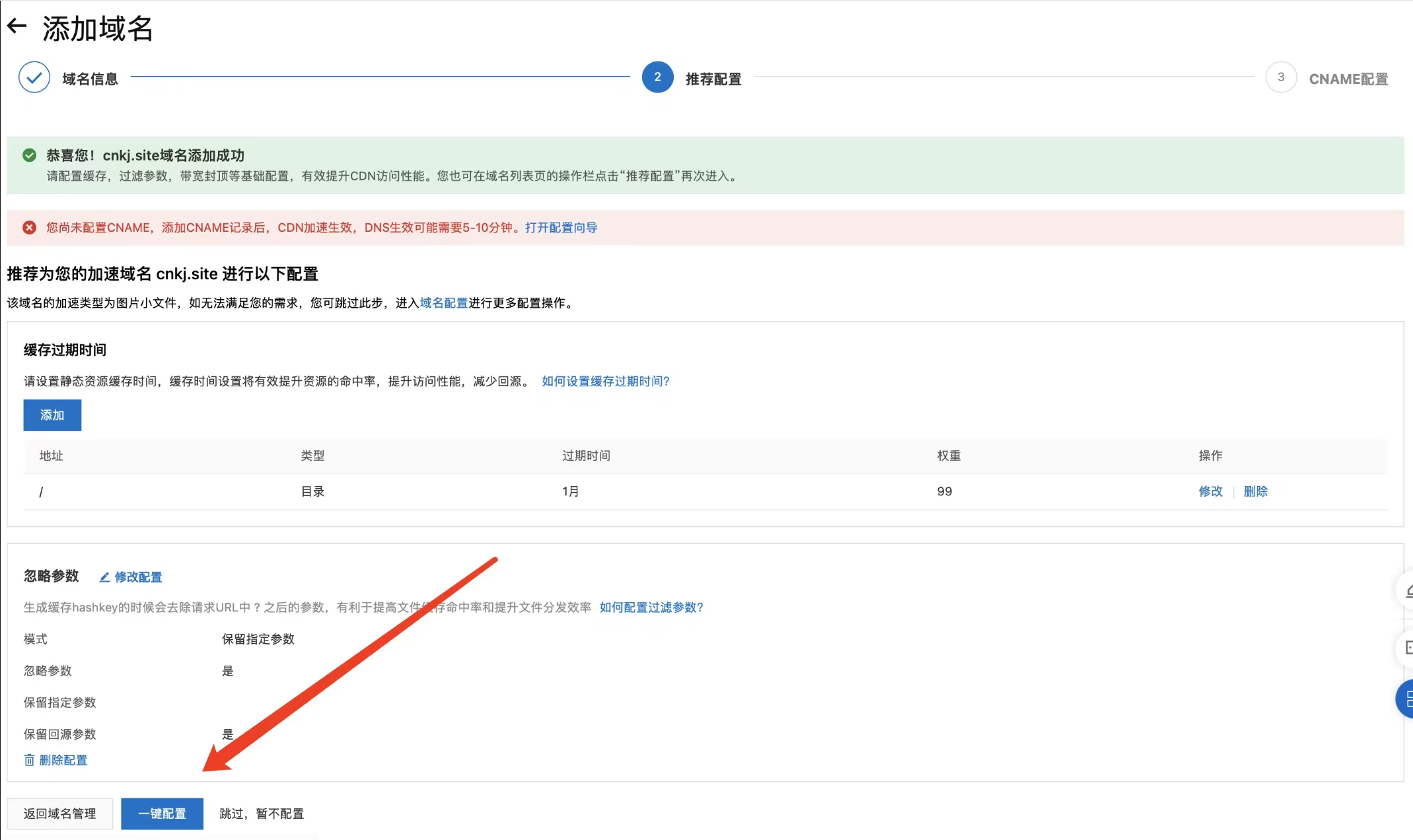 添加完成后点击下一步,在下一步的页面中“一键配置”。