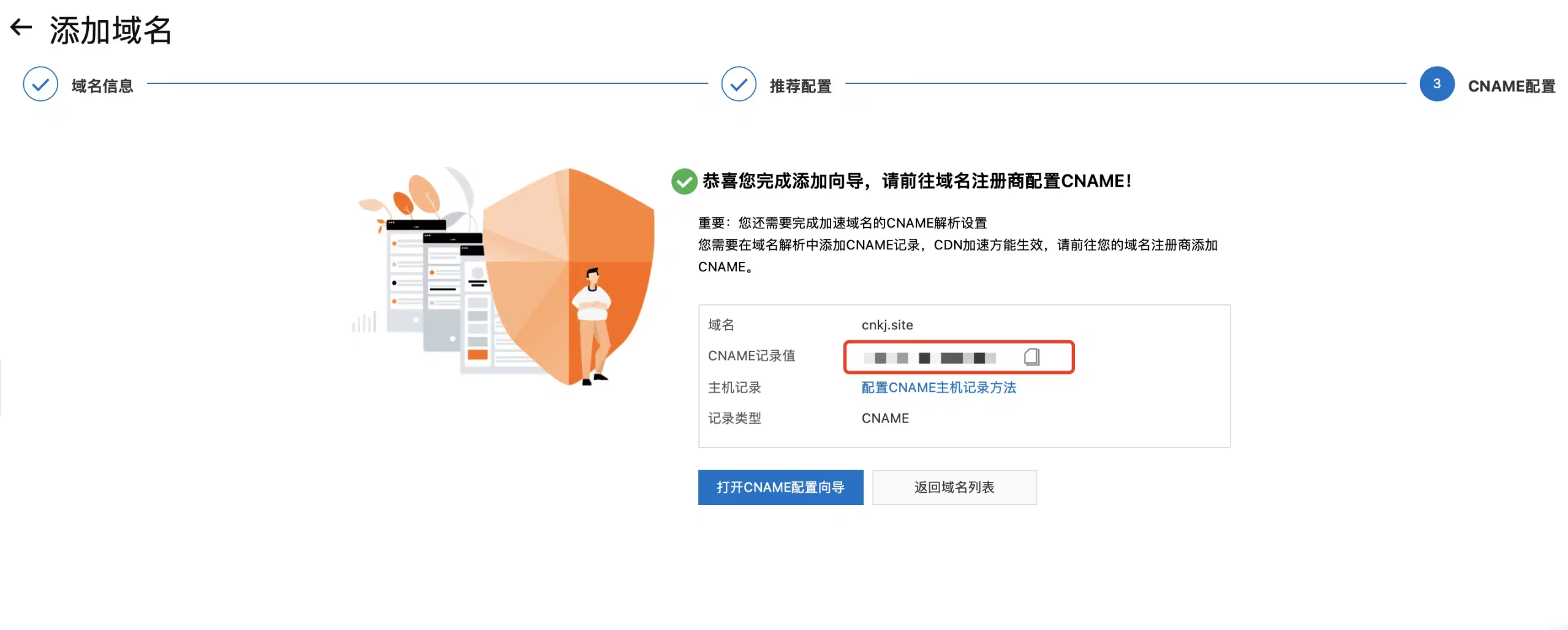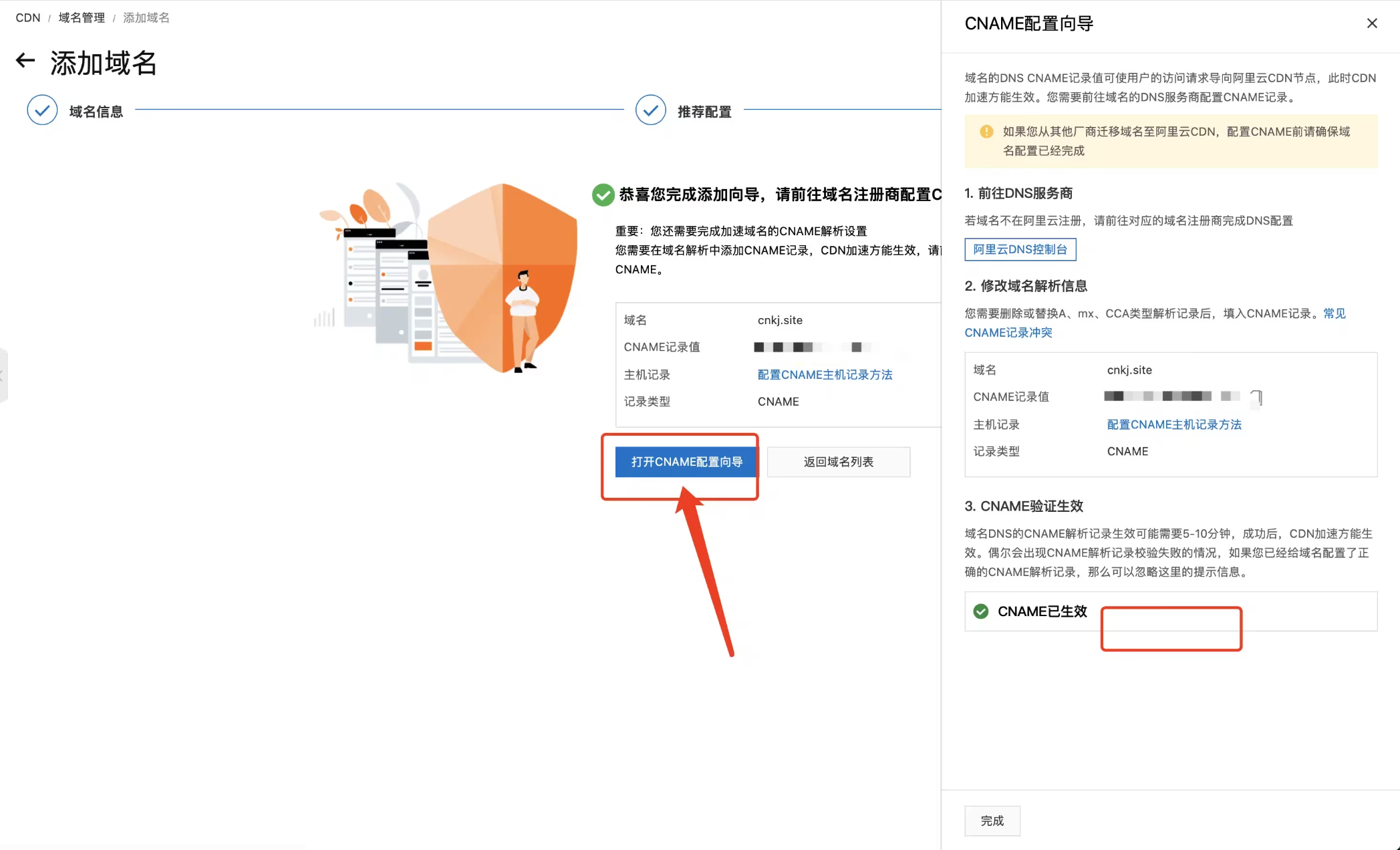 完成新增域名解析后返回CDN配置页面,点击“打开配置向导”,验证配置是否生效。