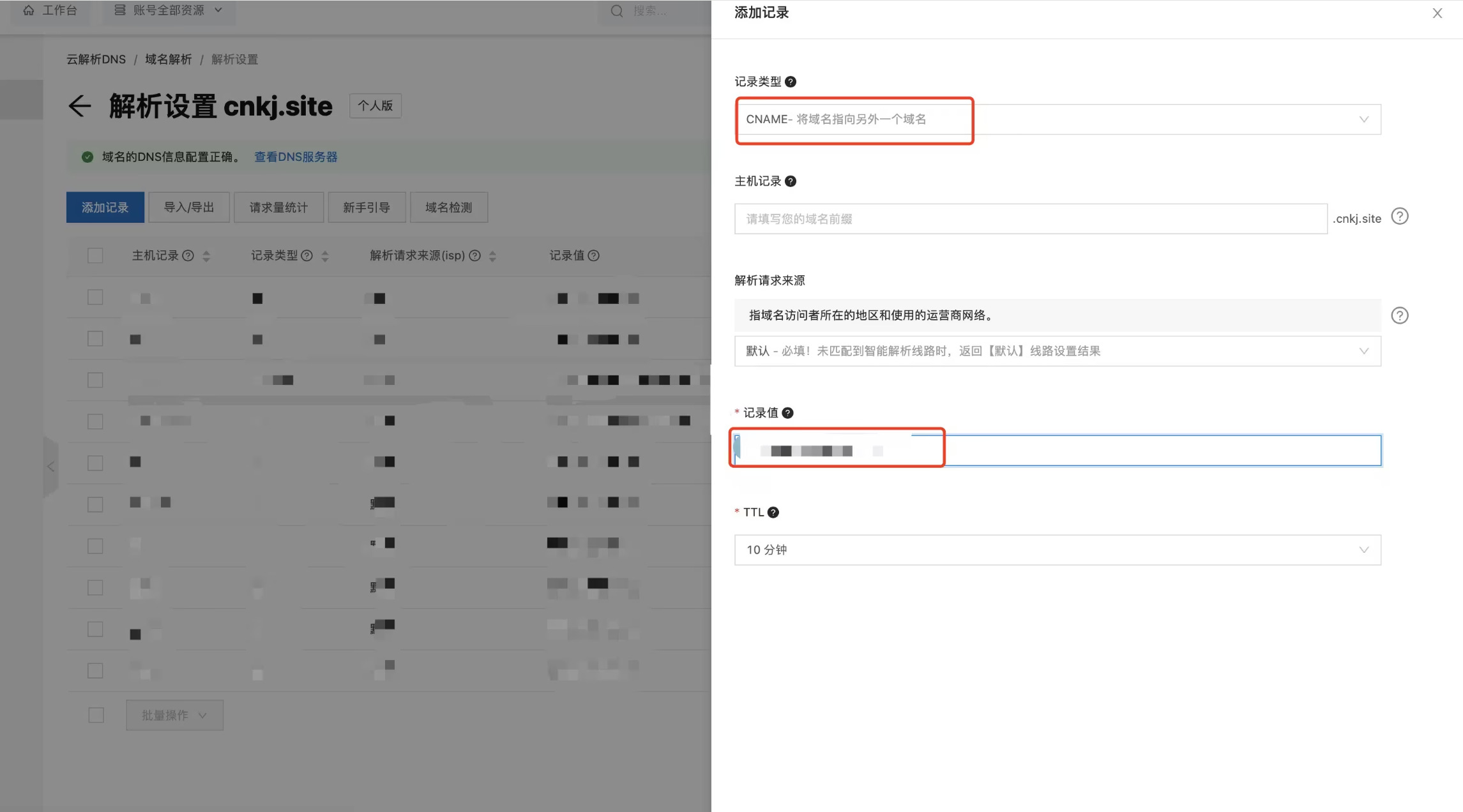 在域名解析页面新增解析,配置DNS,记录值填写上一步中复制的值。