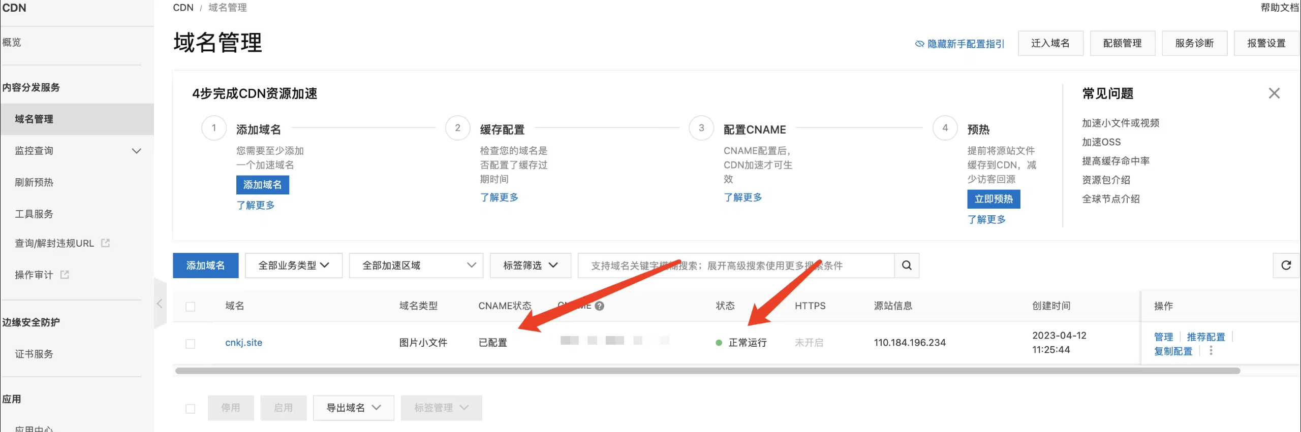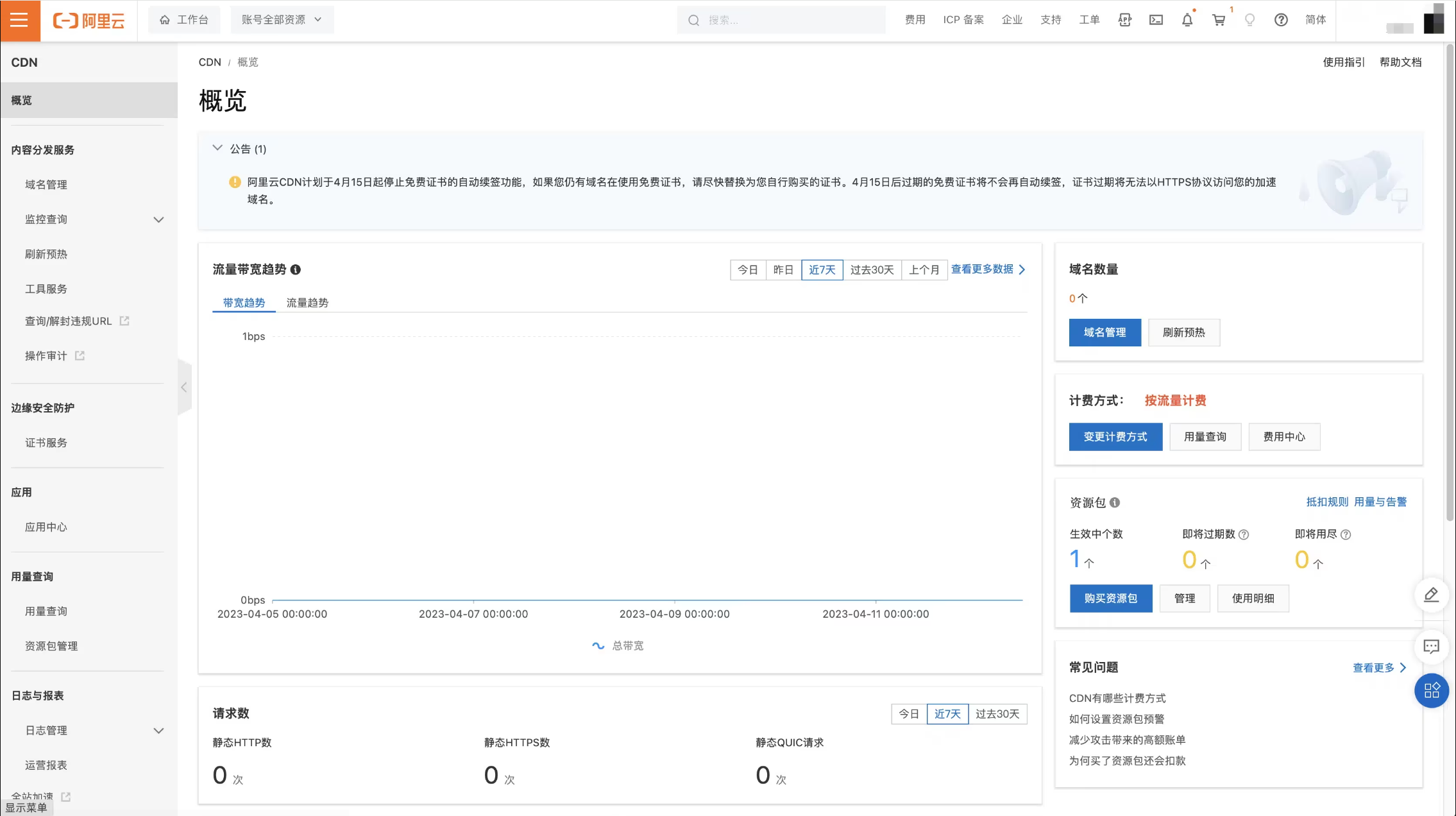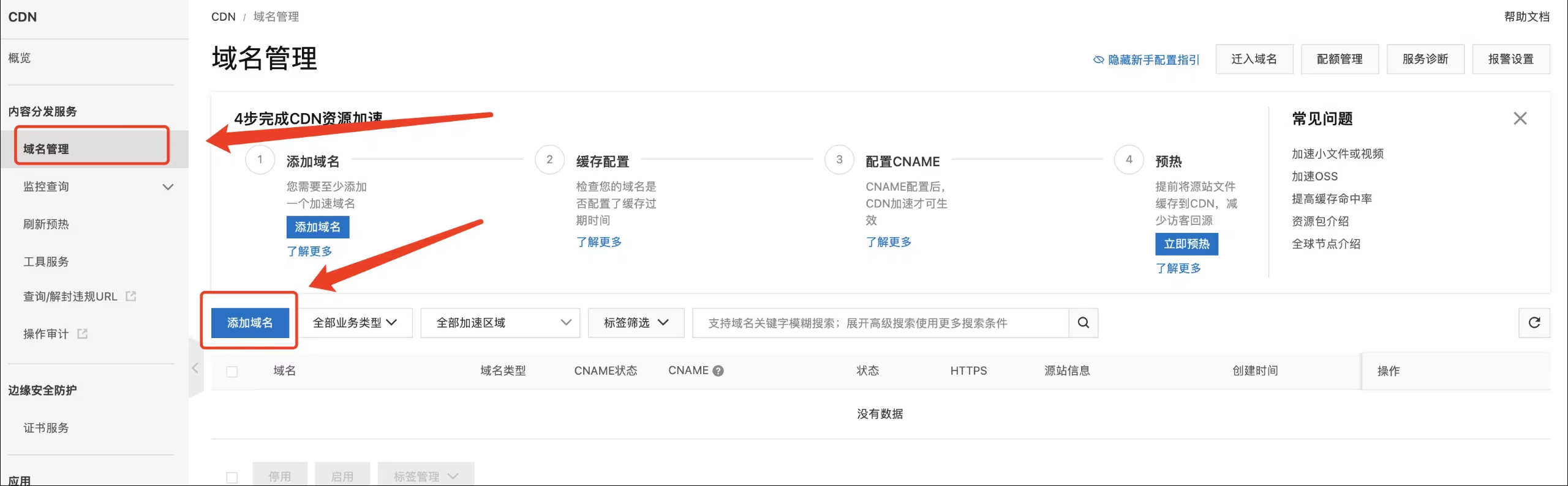 购买完成CDN后访问CDN管理页面 https://cdn.console.aliyun.com/overview
