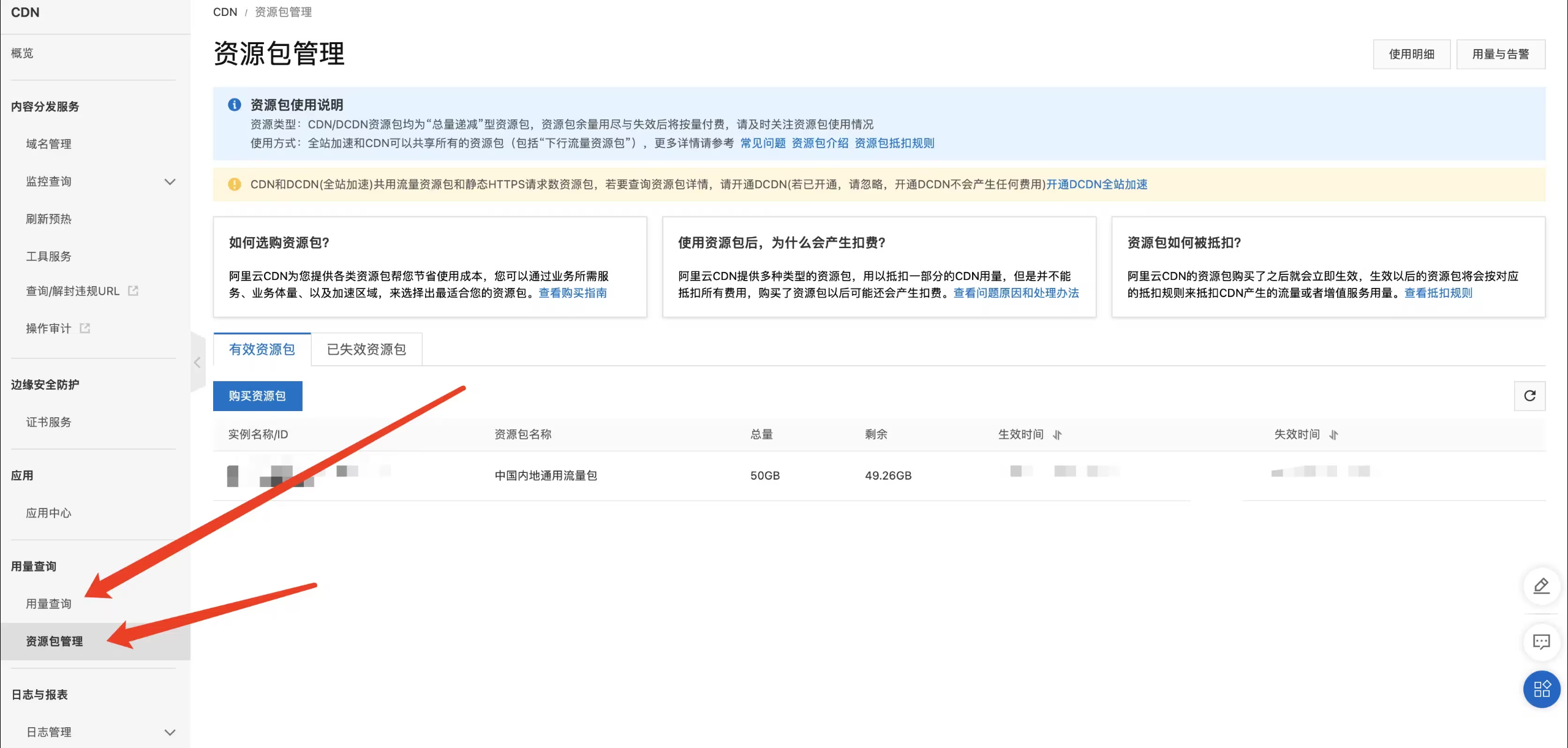 在“用量查询”部分可以查看CDN加速包的使用情况