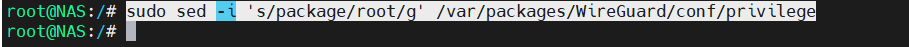 sudo sed -i 's/package/root/g' /var/packages/WireGuard/conf/privilege