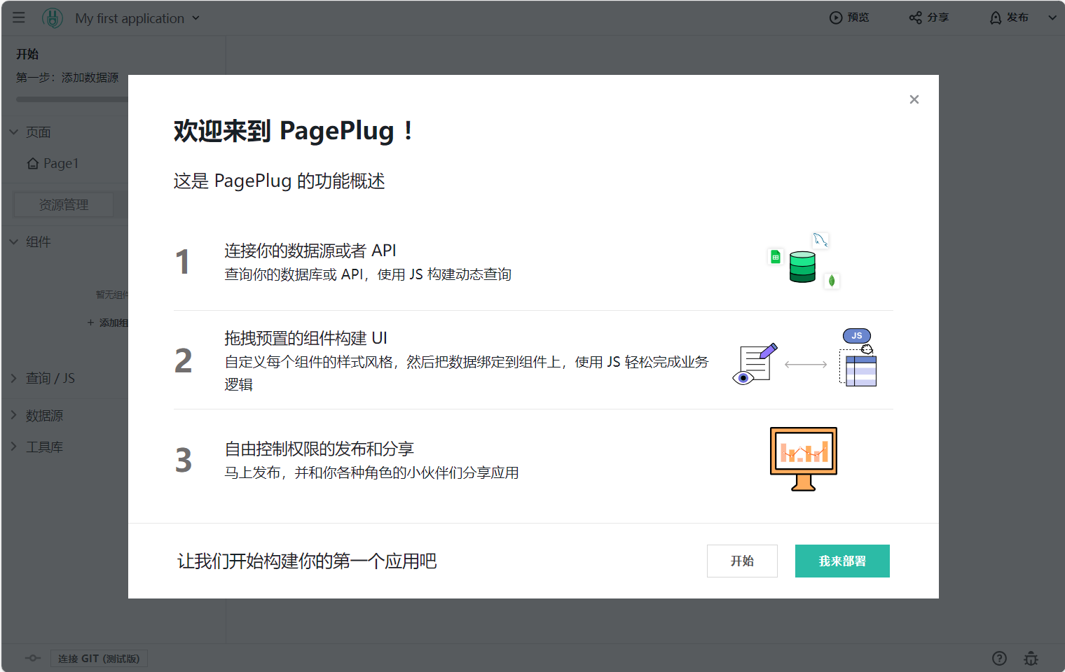 PagePlug 是 Appsmith的中国化项目,是一个开源的、声明式的、可视化的前端低代码框架,可以用来制作 web 应用、微信小程序。