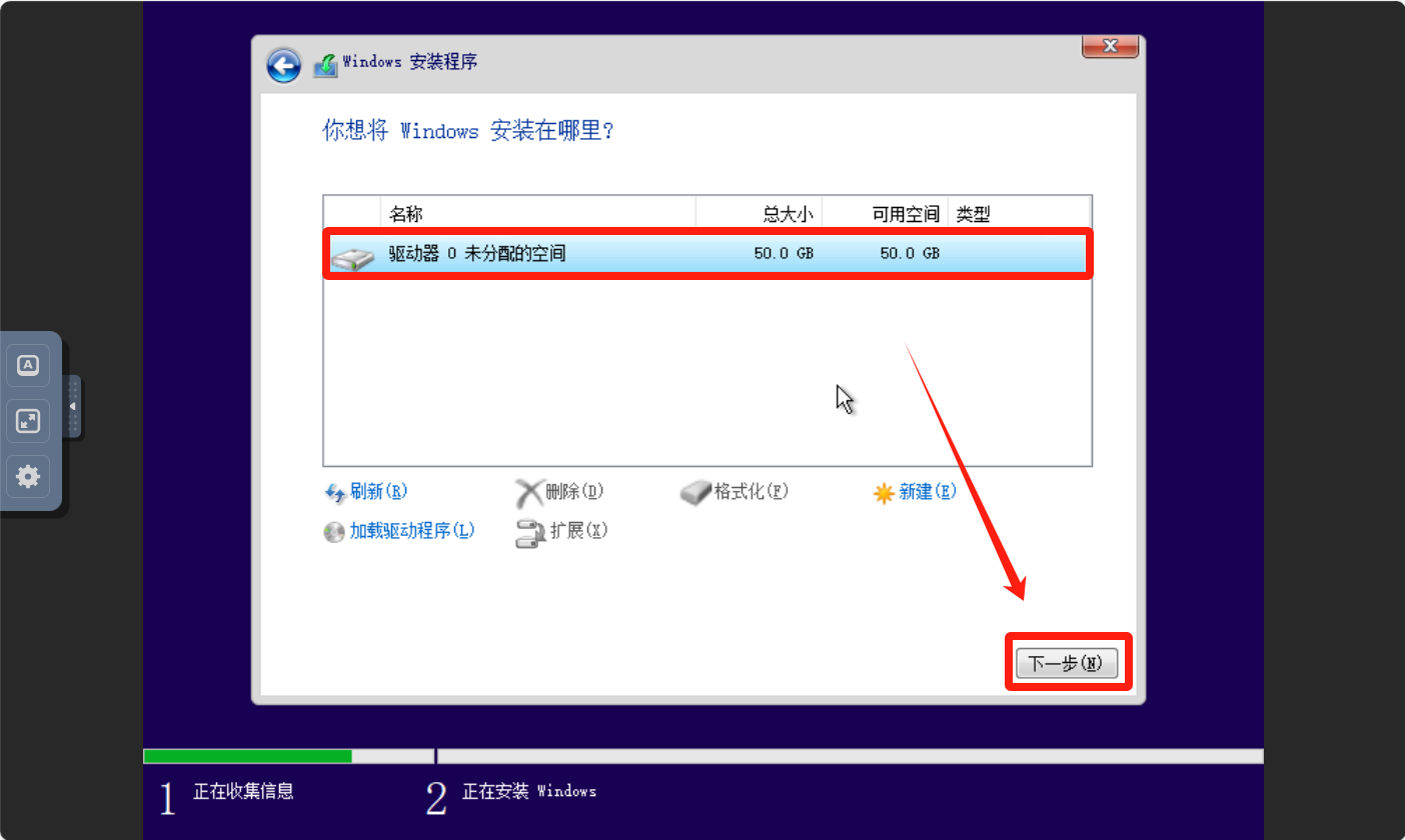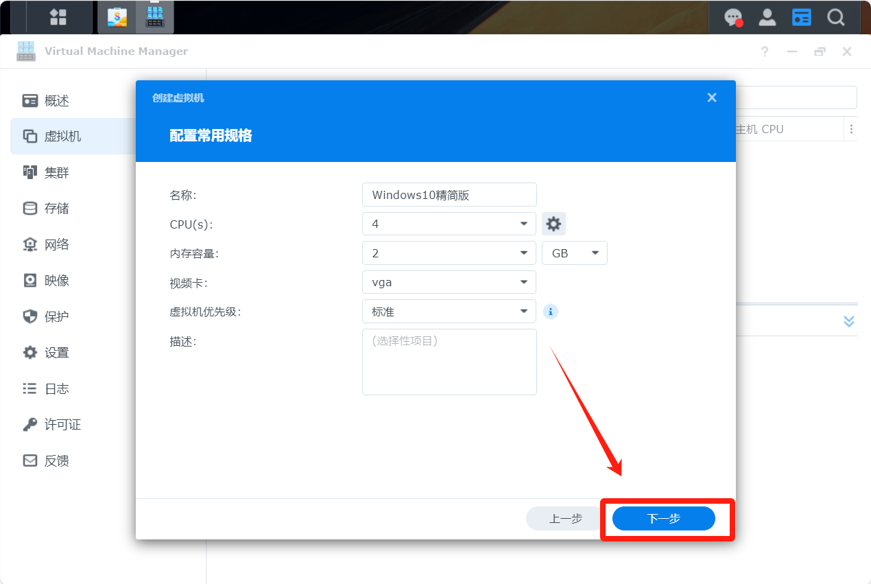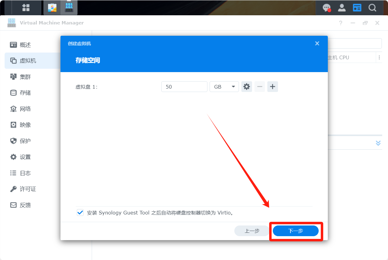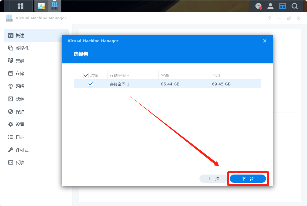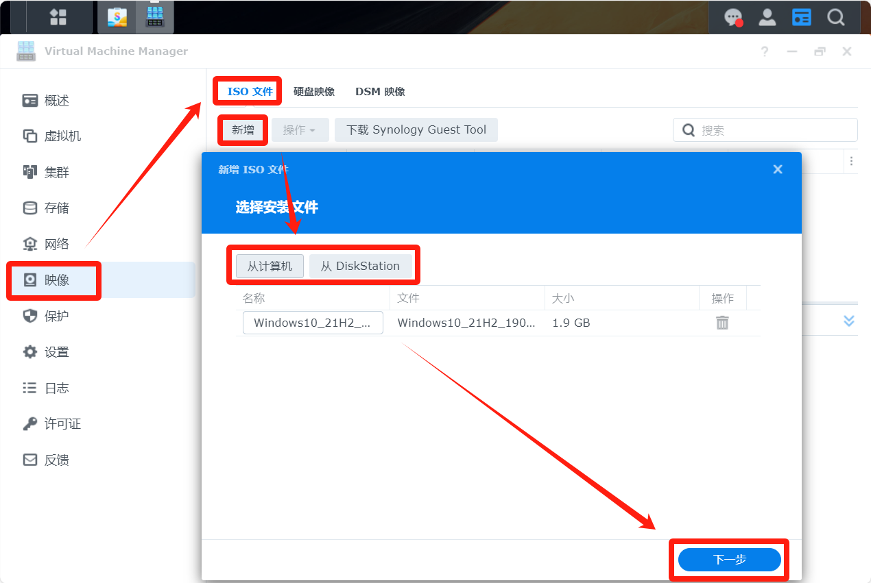 点击上传你需要用到的系统镜像(不支持中文文件名),然后点击下一步。