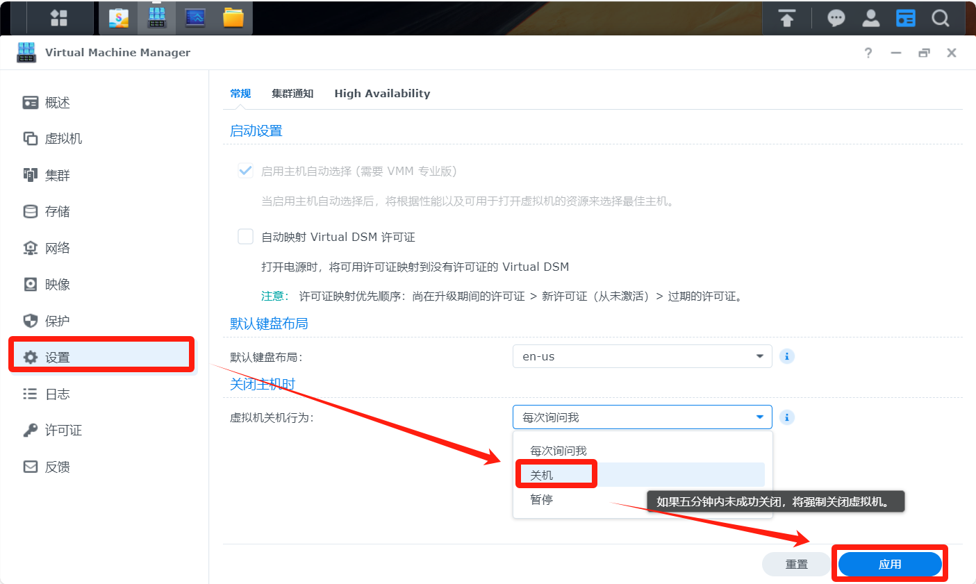 如果不设置关机的话,关闭群晖时会因为虚拟机在运行而受到阻拦。
