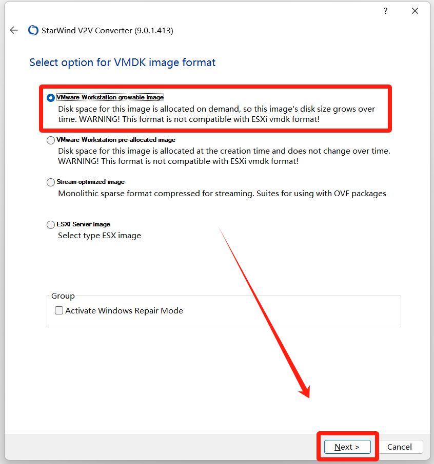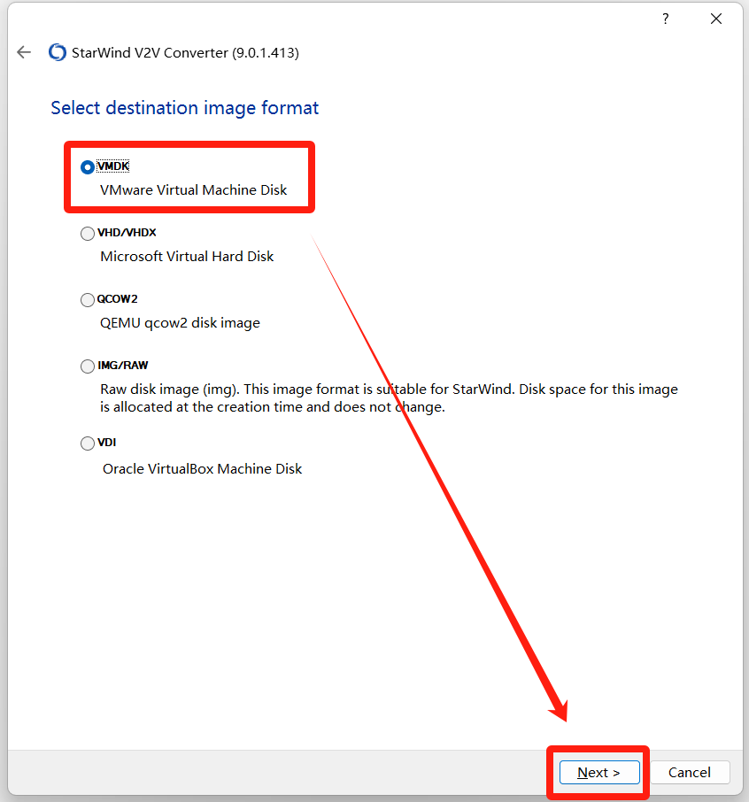 选择需要转换的格式,演示是转换成vmdk(VMware虚拟机格式),点击Next。