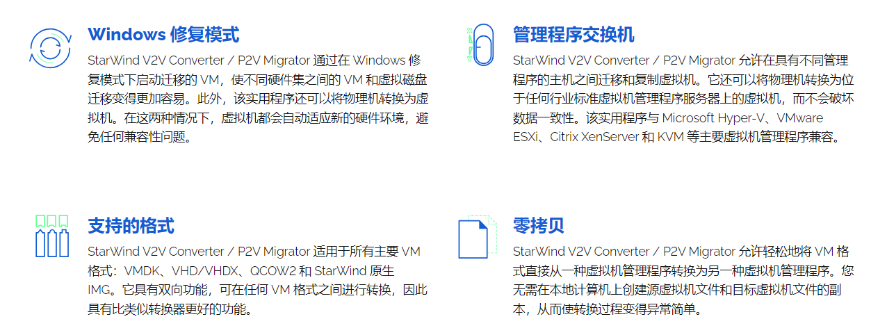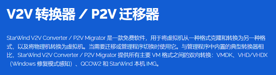 StarWind V2V Converter / P2V Migrator 是一款免费软件,用于将虚拟机从一种格式克隆和转换为另一种格式,以及将物理机转换为虚拟机。当需要迁移或管理程序切换时使用它。与管理程序中内置的典型转换器相比,StarWind V2V Converter / P2V Migrator 提供所有主要 VM 格式之间的双向转换:VMDK、VHD/VHDX(Windows 修复模式感知)、QCOW2 和 StarWind 本机 IMG。