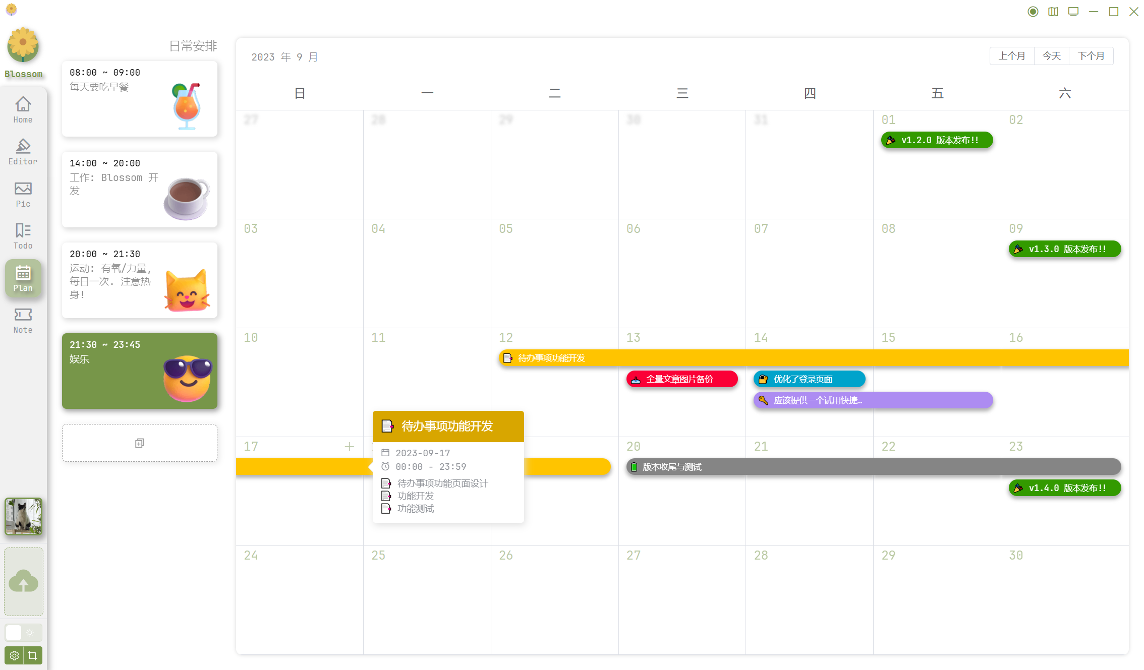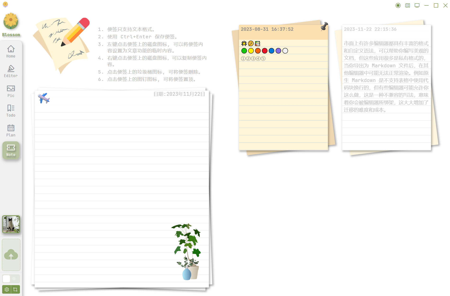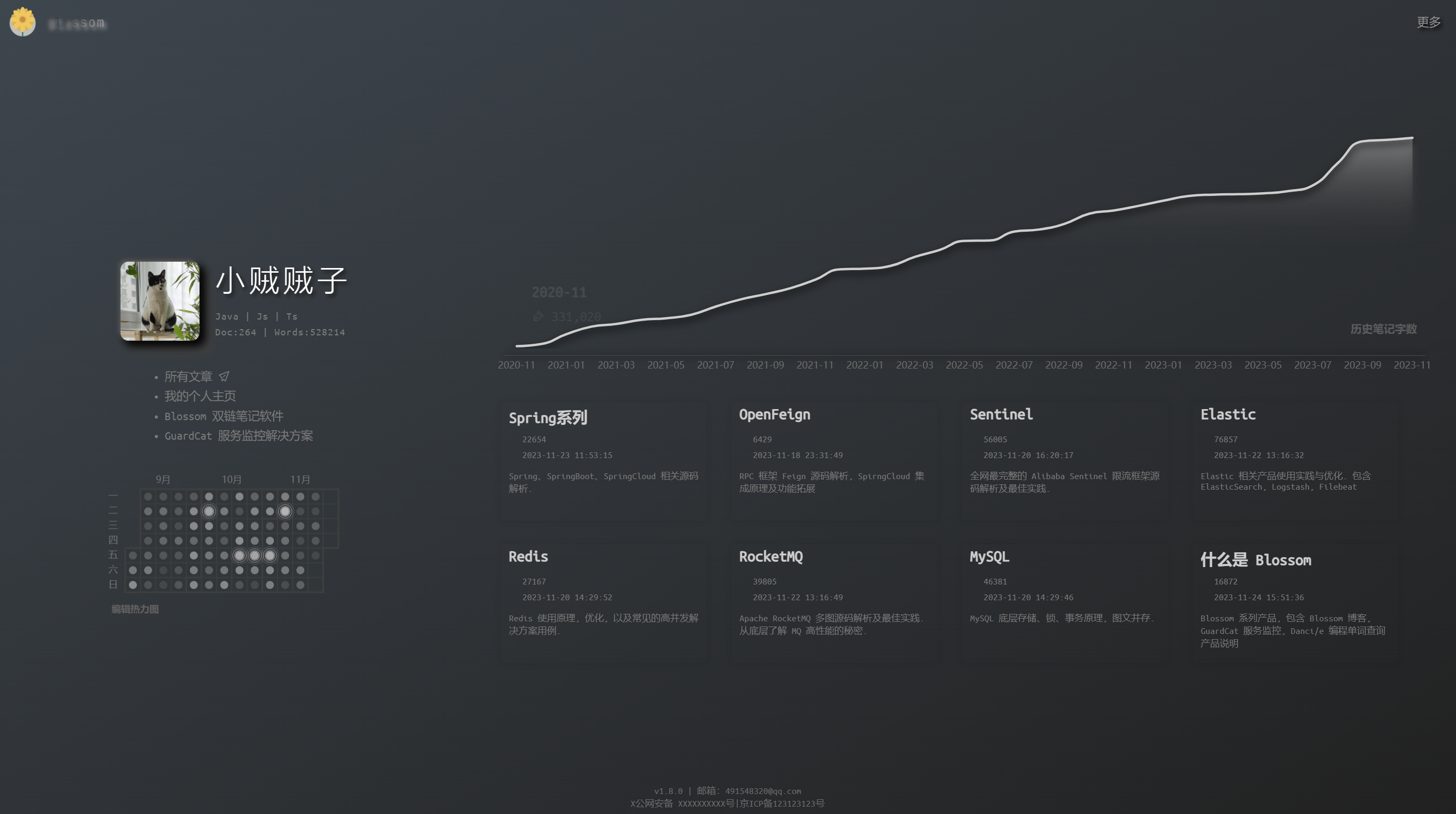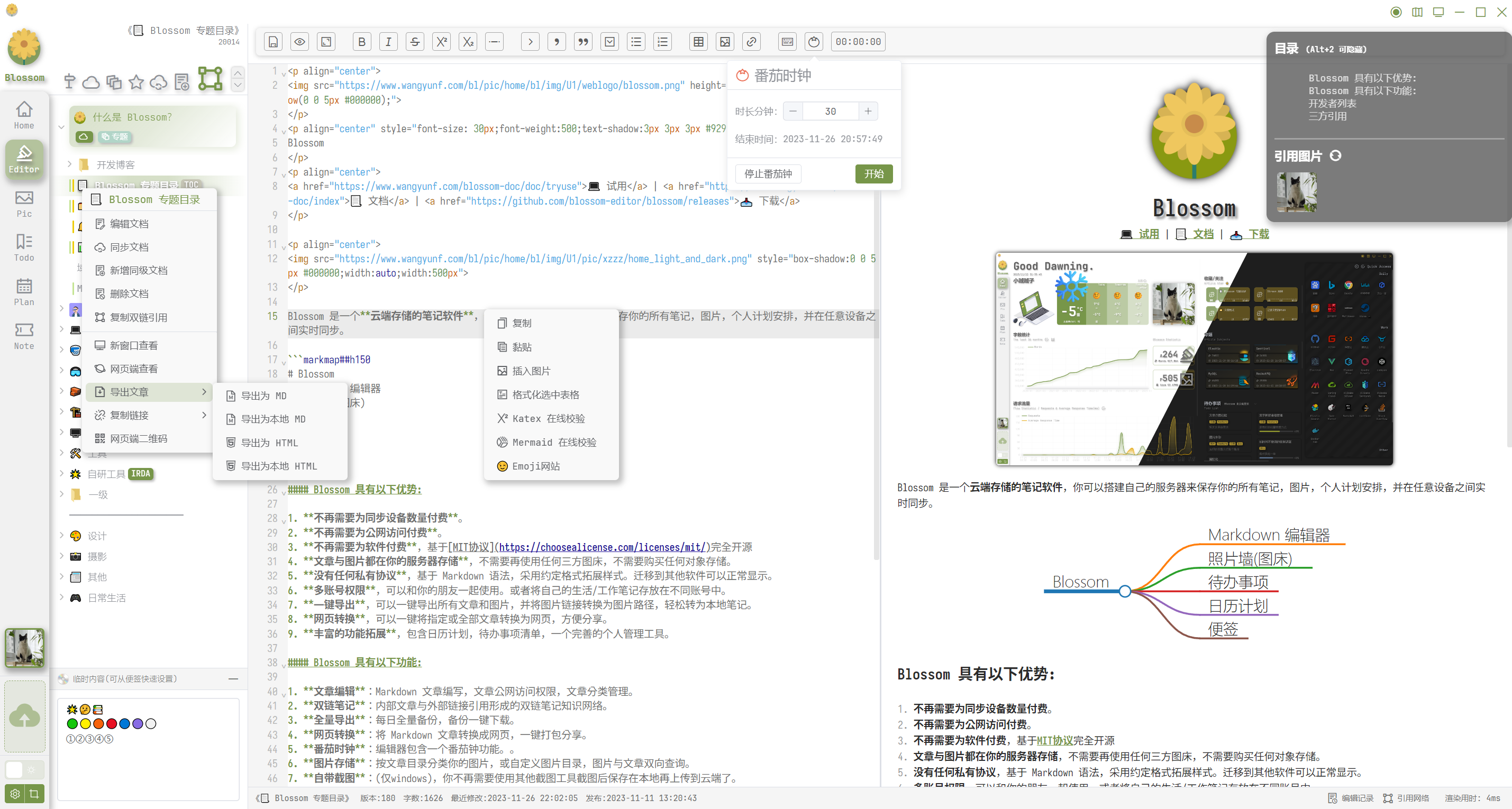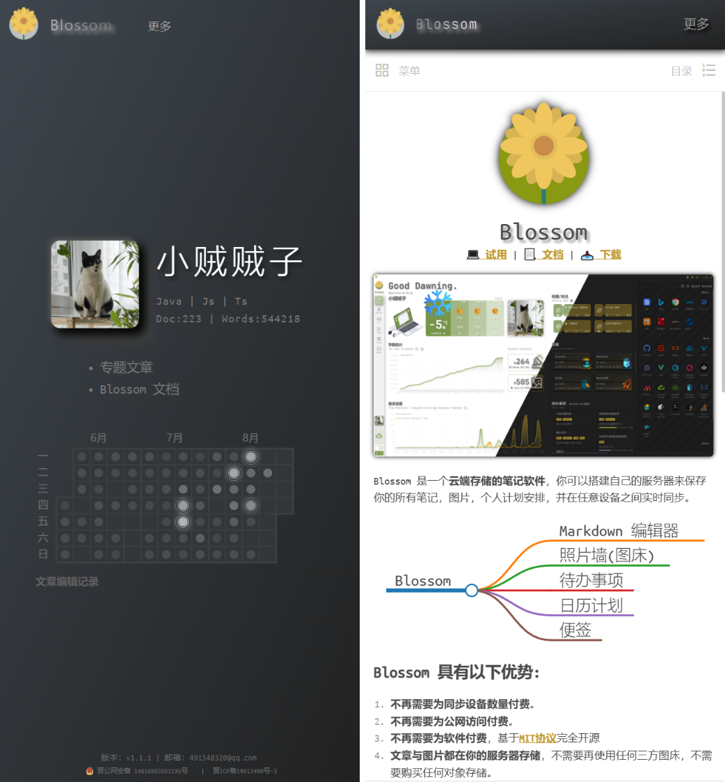 Blossom 是一个支持私有部署的云端双链笔记软件,你可以将你的笔记,图片,个人计划安排保存在自己的服务器中,并在任意设备之间实时同步。同时还是一个动态博客。