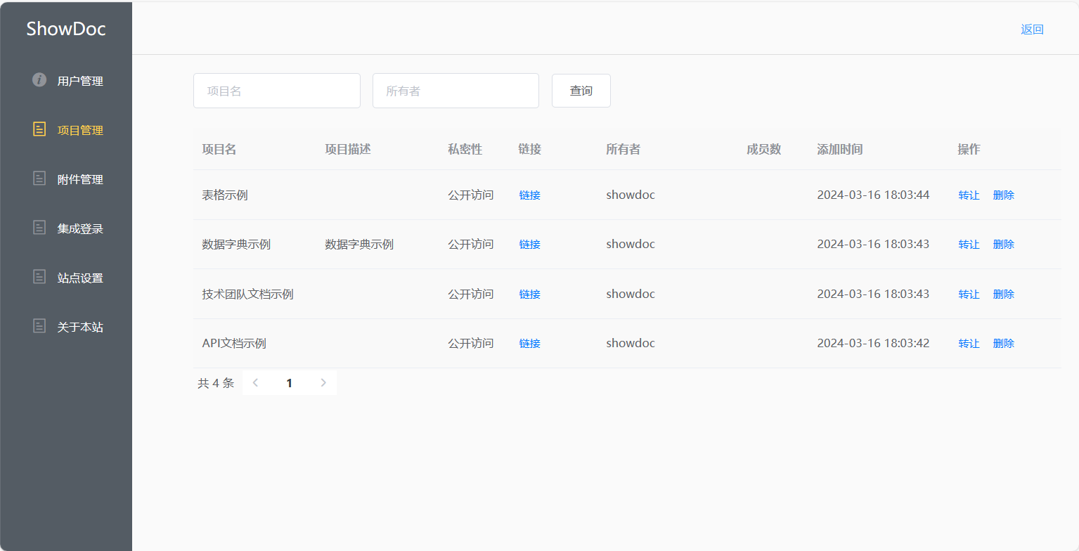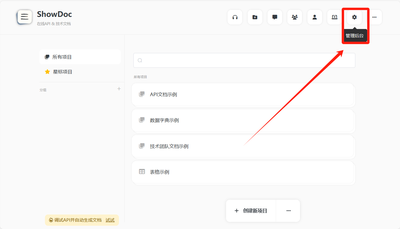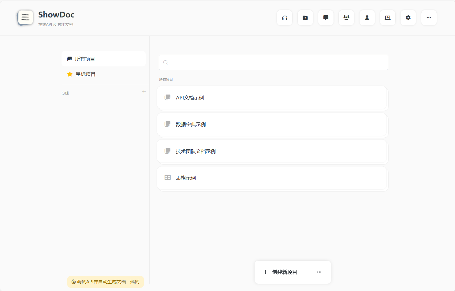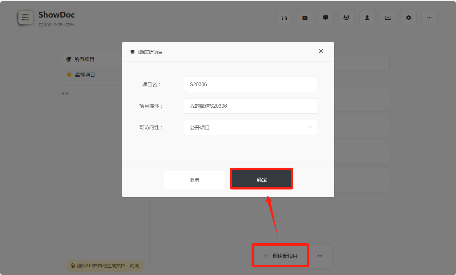 公开项目与私密项目:ShowDoc上的项目有公开项目和私密项目两种。公开项目可供任何登录与非登录的用户访问,而私密项目则需要输入密码验证访问。密码由项目创建者设置
